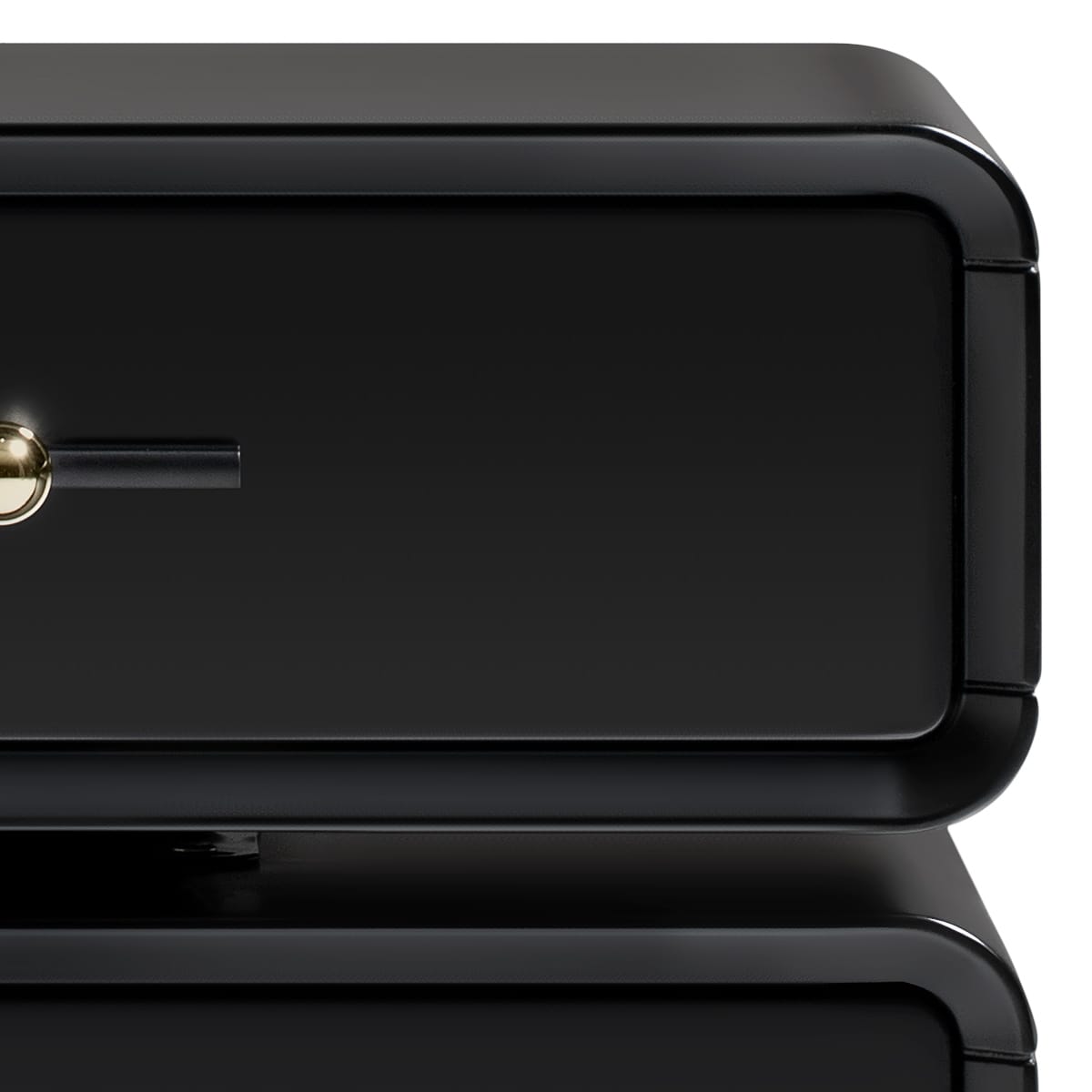 With rounded corners and subtle decor, the two drawers are made of black lacquered wood and ooze stylish modernity. While the borders of the drawers extend past subtly and use panelling, the handle itself uses metal and stunning gold to add some visual interest. Uniquely, the top drawer section can be rotated, granting ease of access or an exciting new look.
