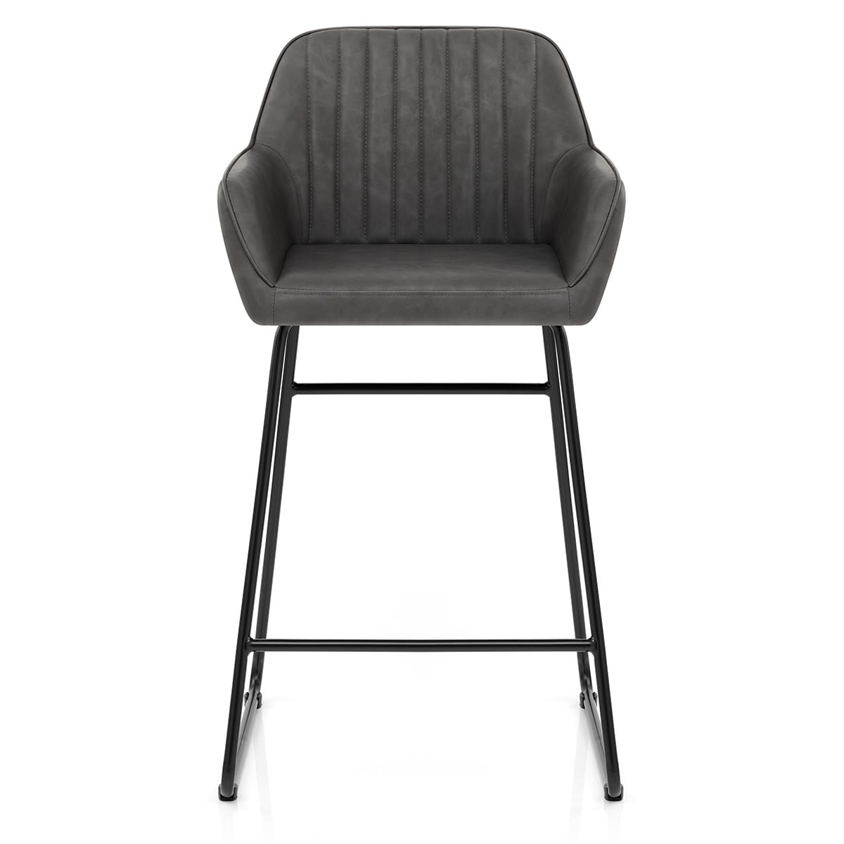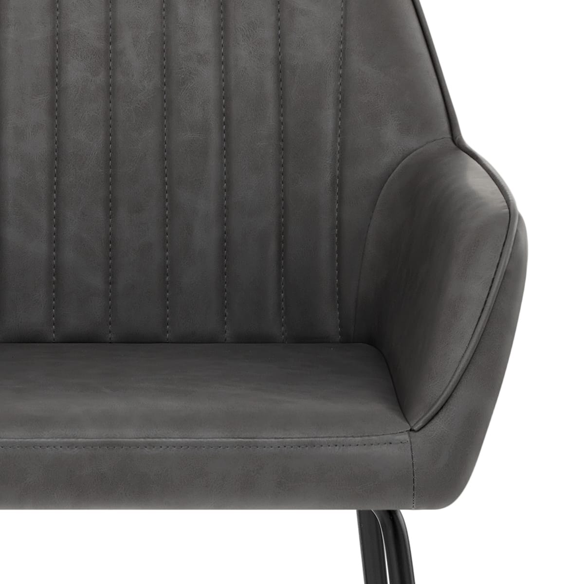 Stitched with detail and care, the seat of the stool is beautifully designed and upholstered in antique charcoal faux leather. This two-toned material combines with the high, vertically stitched backrest to catch eyes. The backrest slopes into convenient arm rests, resurrecting nostalgic comfort. All, and the seat cushion, are sufficiently padded for your rest.