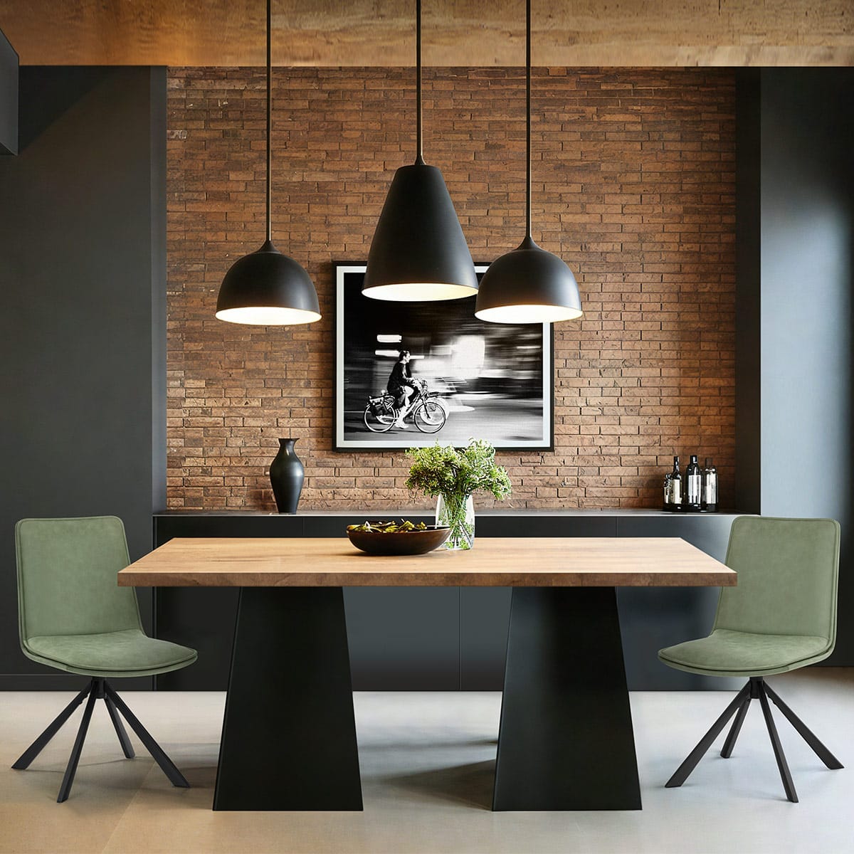 Four strong metal legs house a 360-degree swivel mechanism and are fixed at a standard dining height with a clean, simple design that widens as they flow downwards. Finished in a satin black powder coating, the angular pyramid formation creates a strong, stable base as it splays from top to bottom. To help protect your floors, plugs have been situated at the end of each of the legs.