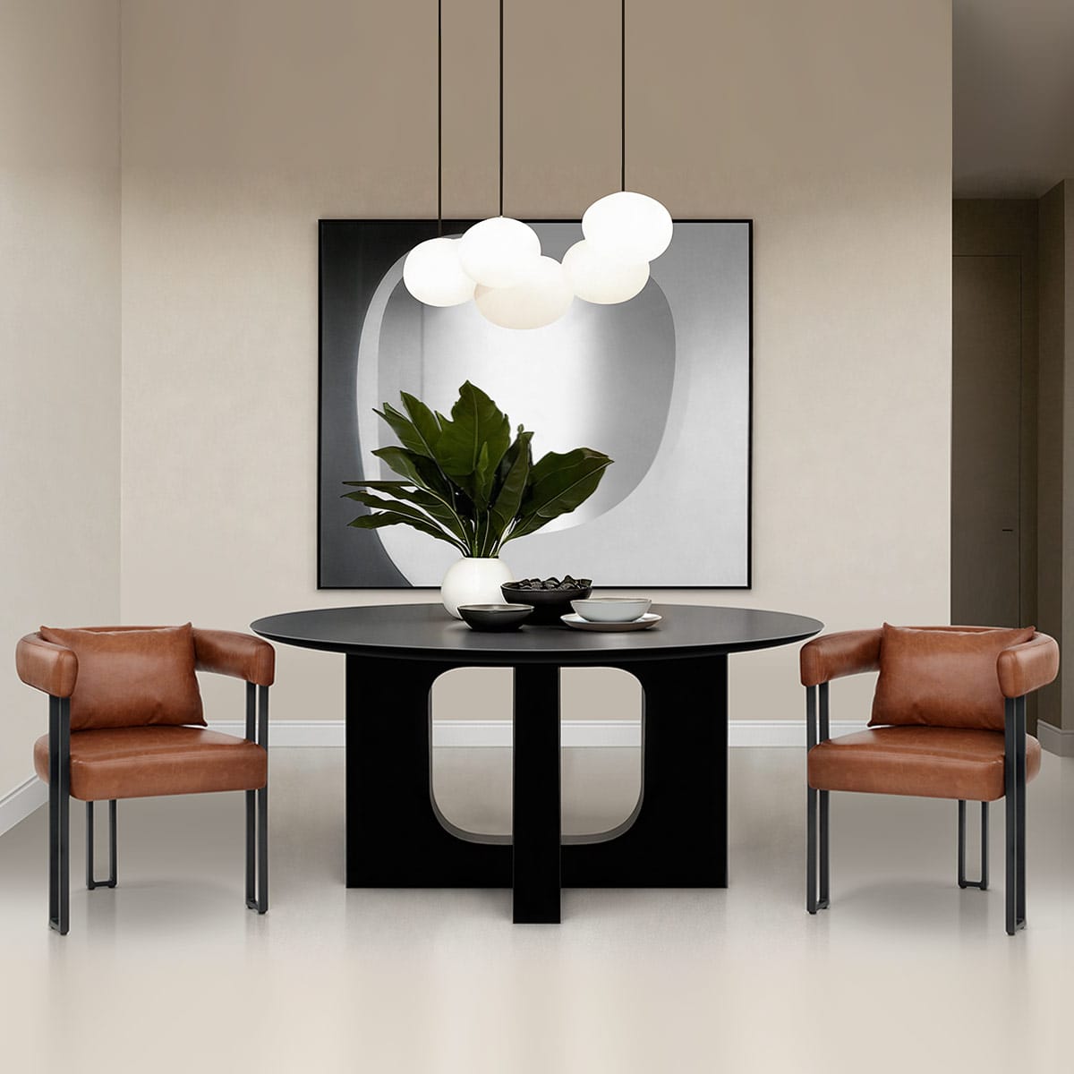 Satin black powder-coated metal forms the Gigi's bold frame. Three sleek rectangular legs create a sculptural base and extend upward to support the seat, arms, and back, enhancing the chair's geometric appeal. This modern structure balances style with strength, while adjustable floor protectors ensure stability on any surface, helping to make this a smart, durable choice for dynamic interiors.