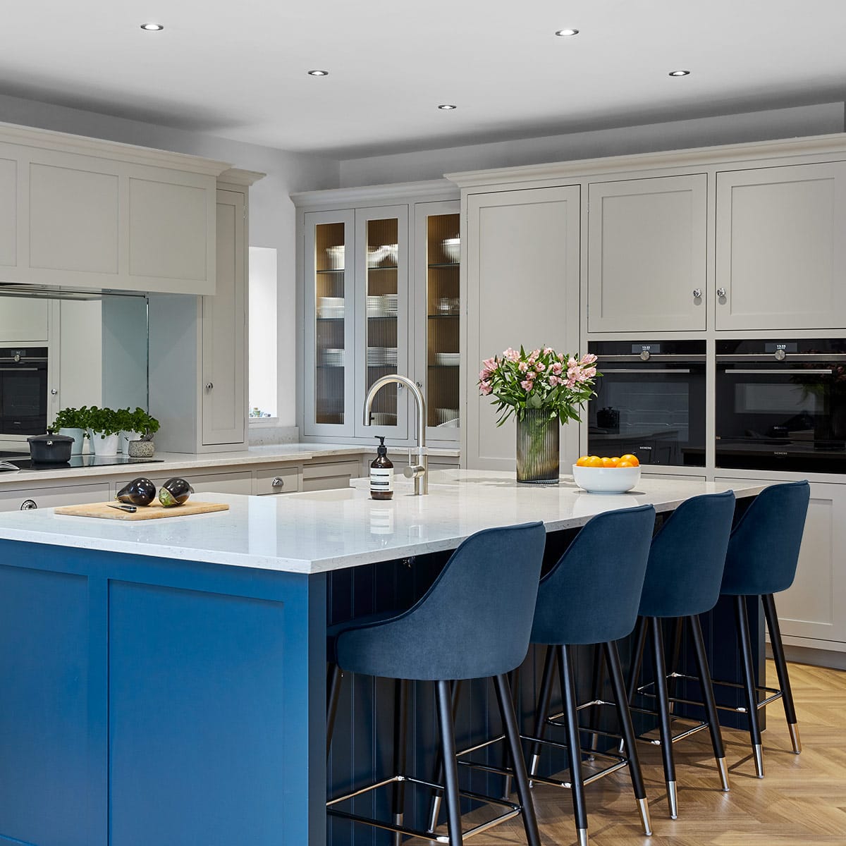 Beautiful in blue, the velvet upholstered seat is comfortably padded and features a high backrest. The back wraps around the seat for a supportive feel, creating a truly luxurious item.
