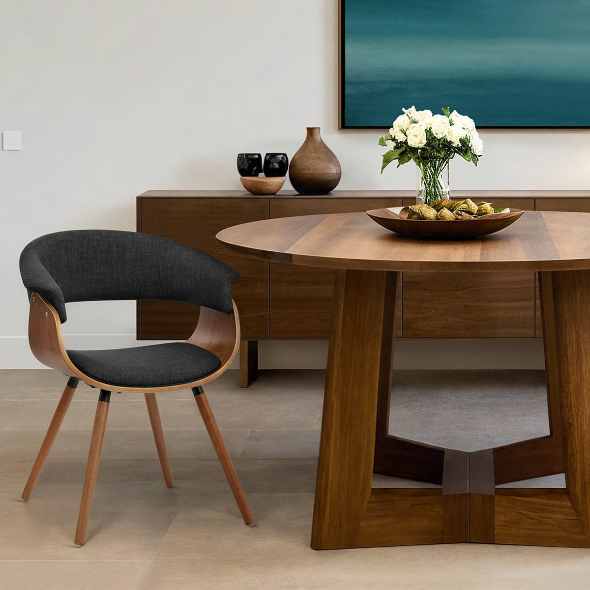 Retro design at its best, the Grafton Dining Chair Walnut and Grey is a visual treat that does not compromise comfort. Suitable for a whole host of modern and traditional decors, this dining chair has the ability to be placed around various styles of dining table or as a supplementary seat within the home.