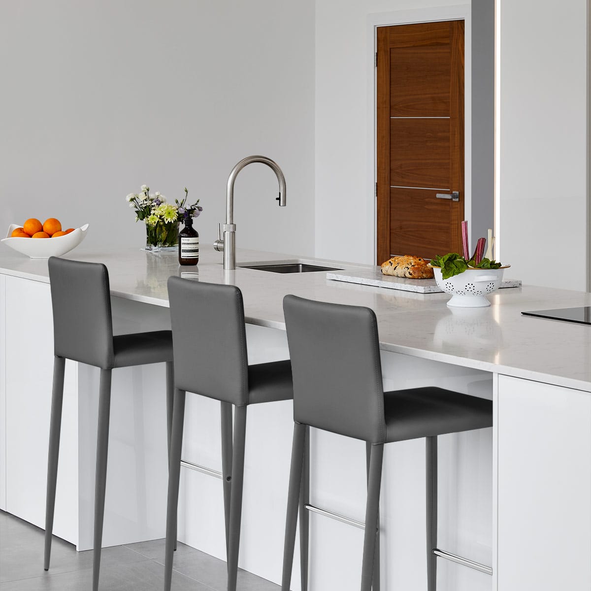 Fixed at kitchen counter height, the four-legged frame is upholstered in matching faux leather, whilst the footrest is crafted from polished chrome, affixed to the frame at just the right height for supporting your feet. Not to be missed, the Healey also includes protective floor plugs to help to look after your floors, cementing its fantastic reputation.