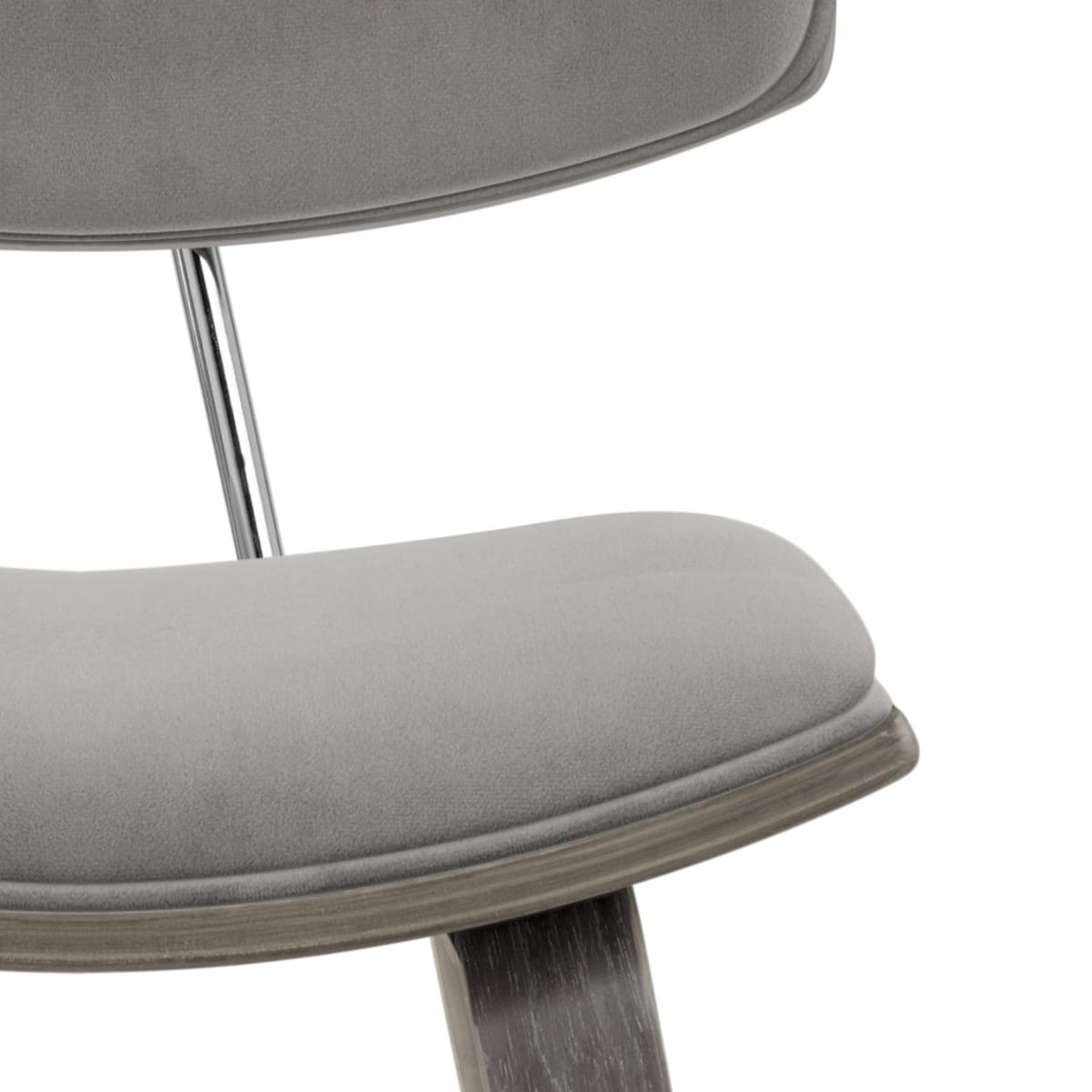 Well padded, the plush grey velvet seat and backrest pad bring comfort and style to the stool, whilst the supportive back is connected to the seat by a chrome frame. The arched bentwood seat and backrest have a light grey antiqued finish that matches the frame below and gives a modern touch to the natural wood grain.