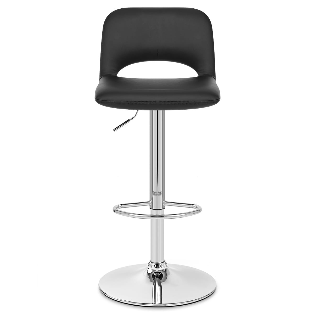 The stool's height can be adjusted as needed through a gas lift mechanism, which also allows for 360 degree swivel movement. The frame includes a polished chrome finish for a modern accent to the seat. With a curved footrest on the column, and a circular domed base complete with floor guard, the Hugo is exceptionally practical as well as stylish.