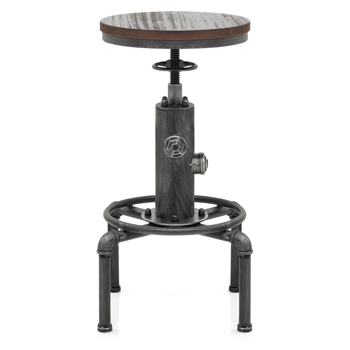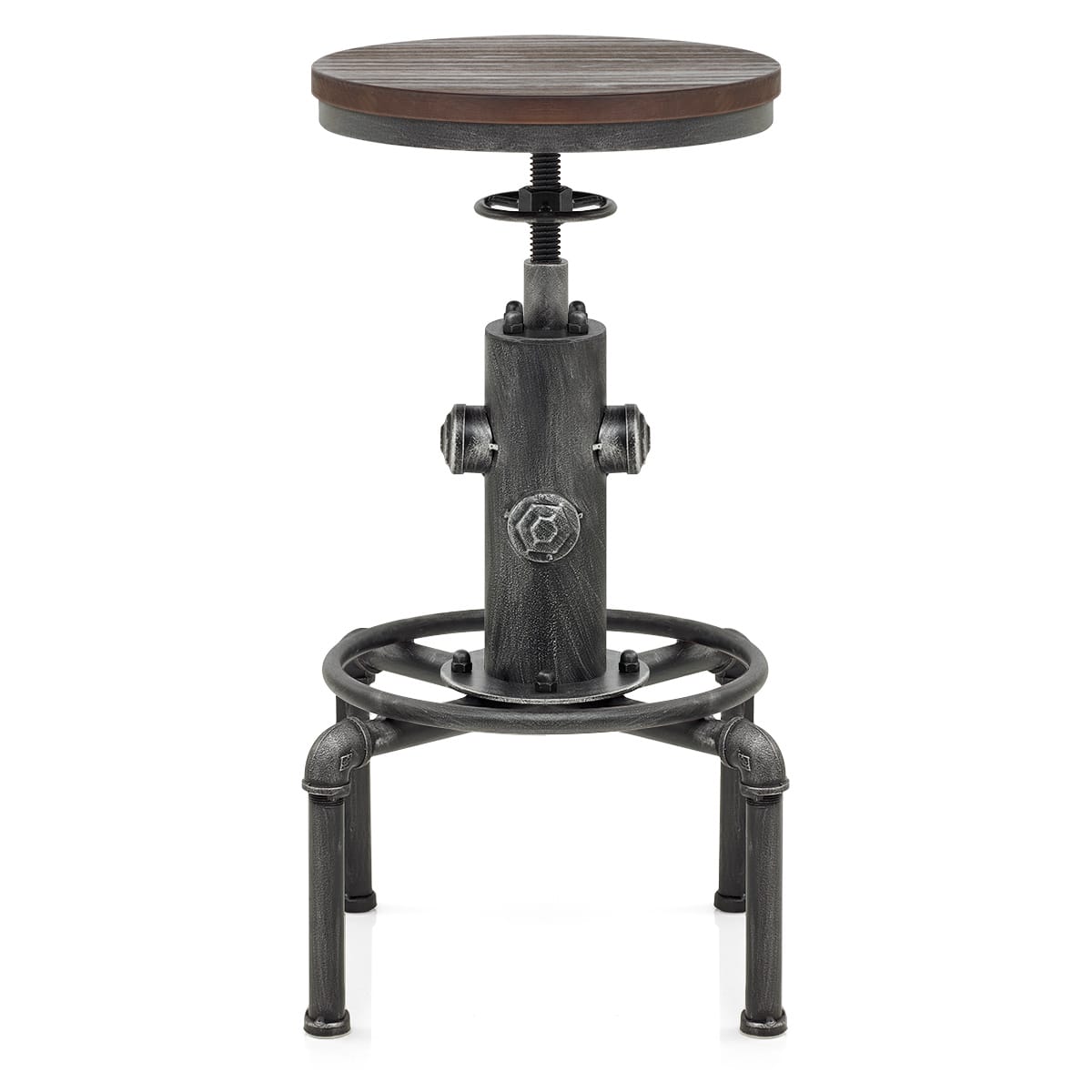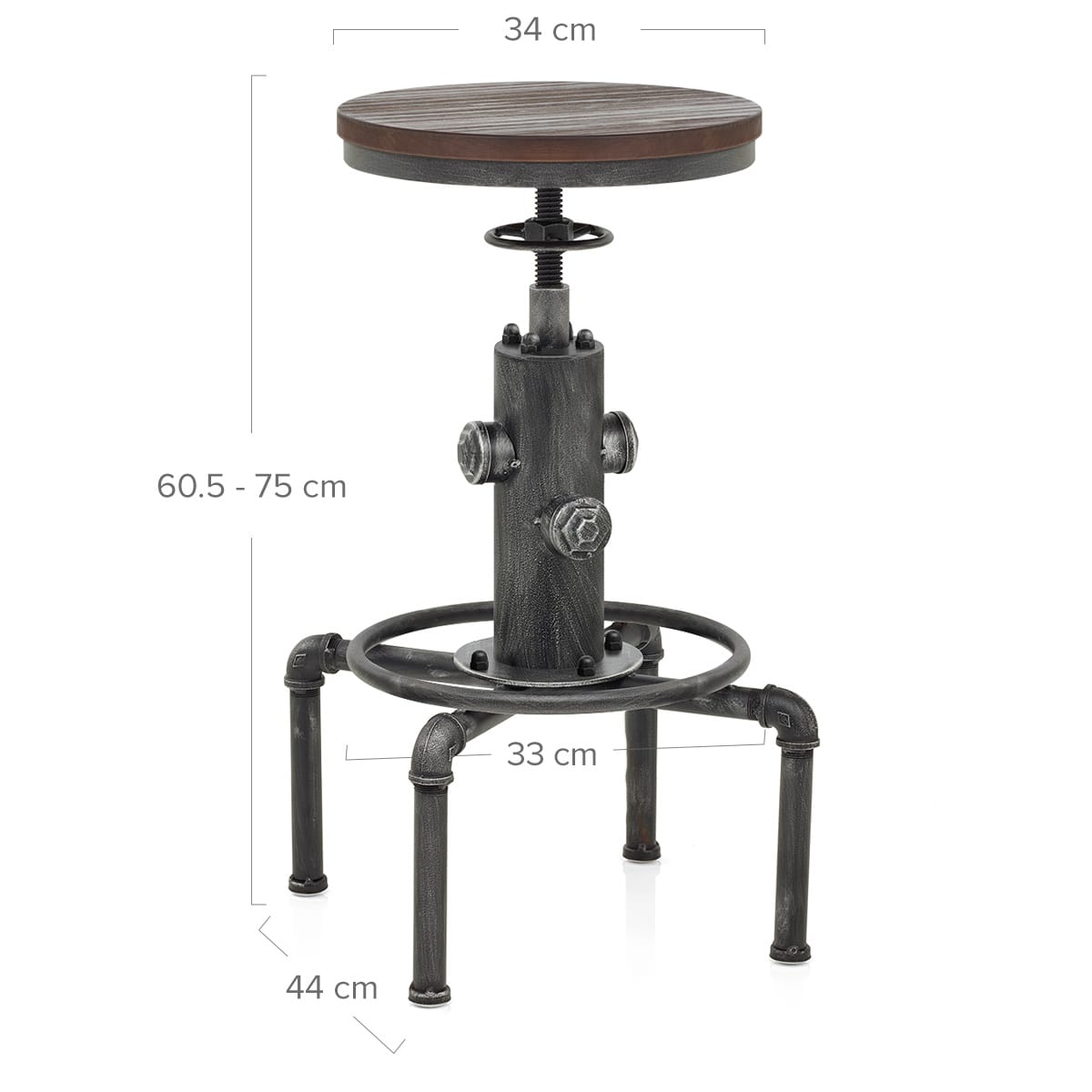 A round dark wood seat tops the design with a rustic finish, and is backless for easier storage under worktops. Beneath the seat is a screw thread for variable height, and it can also turn through 360-degrees.