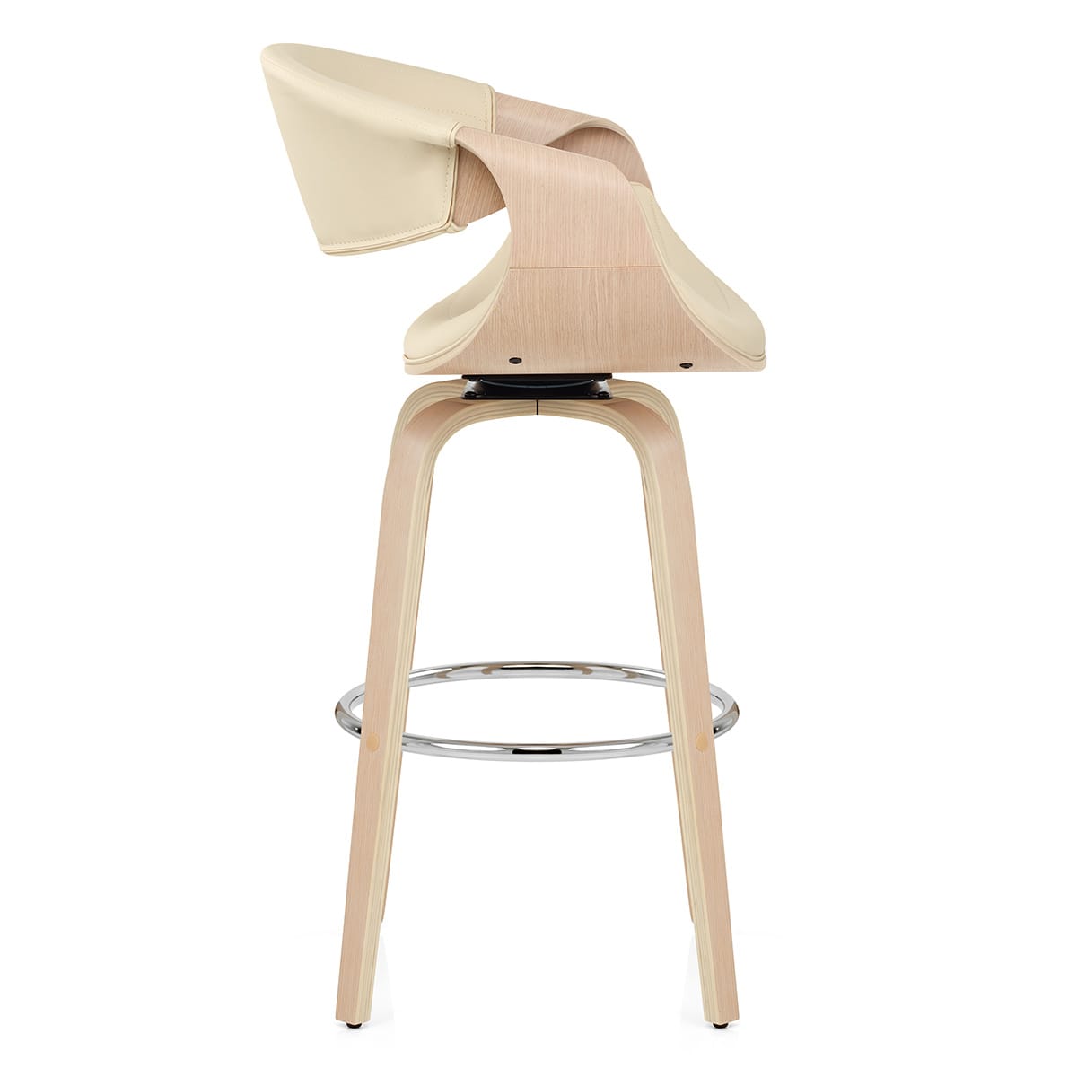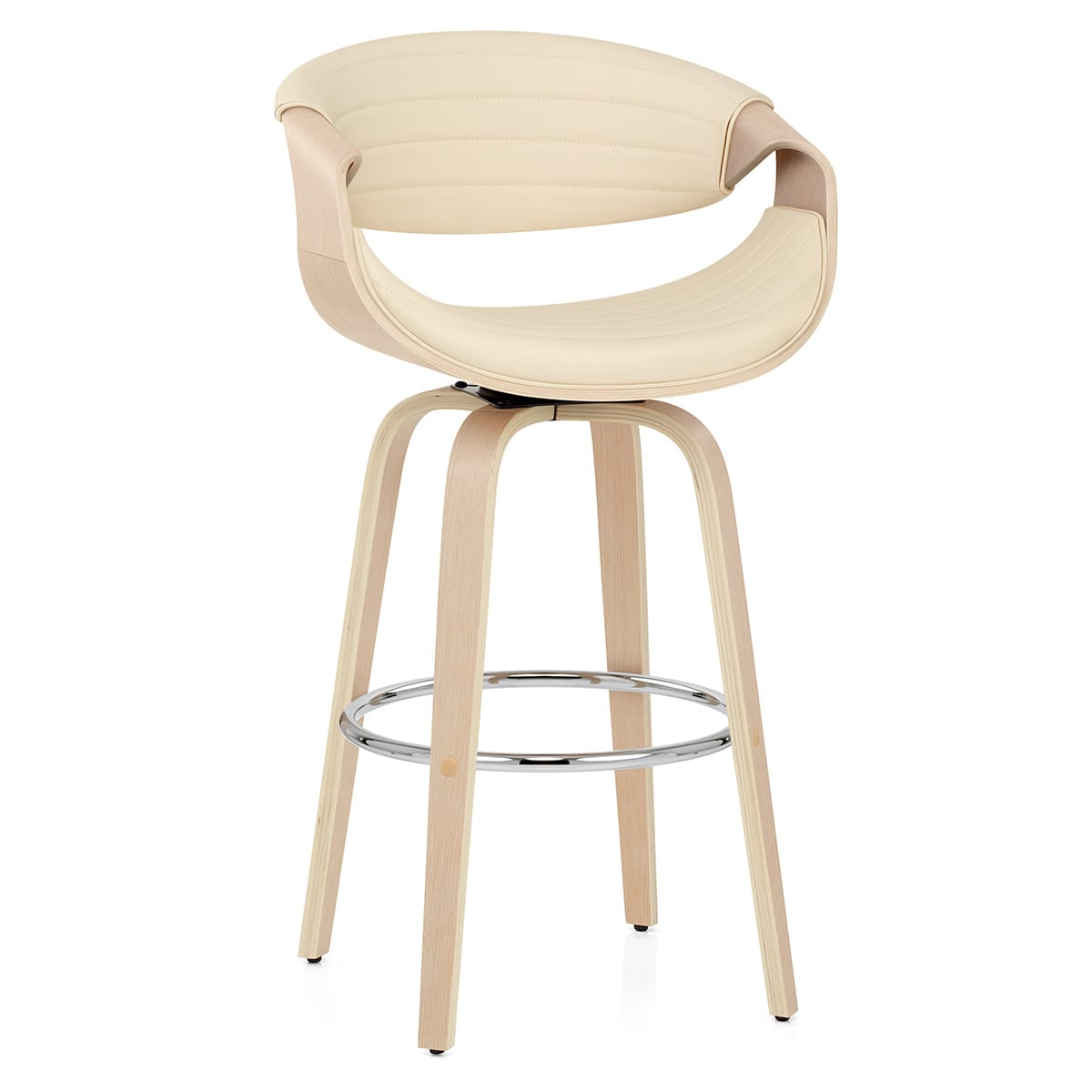 Finished in a light bentwood, the frame perfectly matches the shell of the seat above. It is fixed at a premium kitchen height and incorporates a swivel plate that allows for a 360-degree rotation. Its four rectangular legs, with a chrome circular footrest, make it sturdy and the protective adjustable feet integrated onto the frame help keep your floors safe from scratches or scrapes.