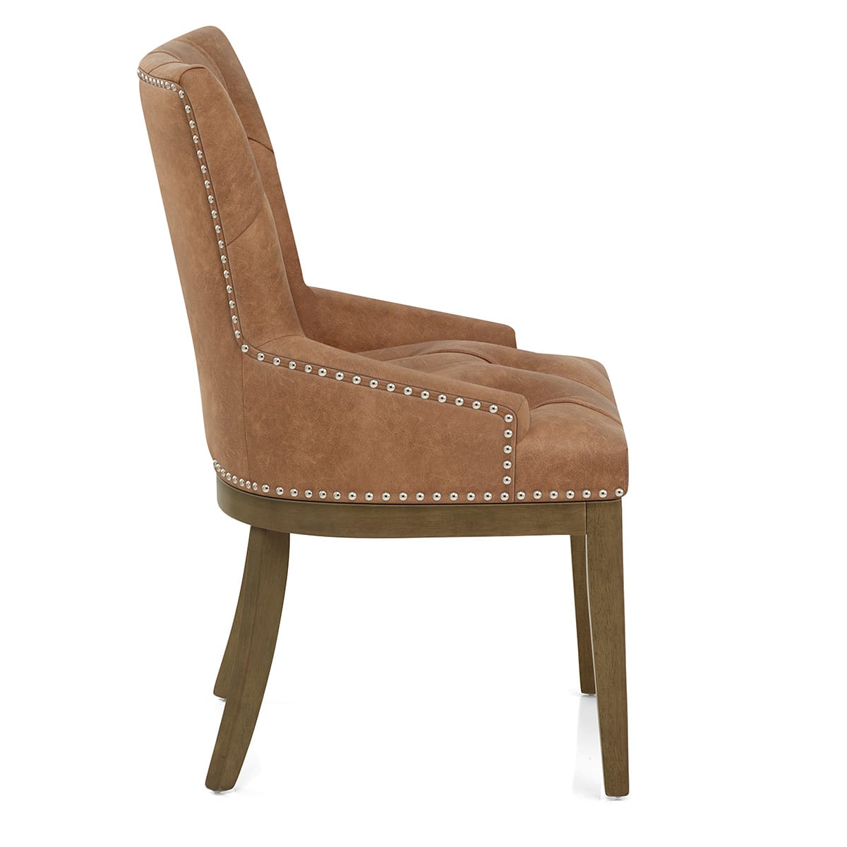 Wrapped in smooth tan faux leather, the seat is luxuriously cushioned and reinforced with a belted support system for lasting comfort. The tall backrest features elegant button tufting and a soft curve, while metal studs outline the edges, creating a sophisticated frame for the chair's classic silhouette.