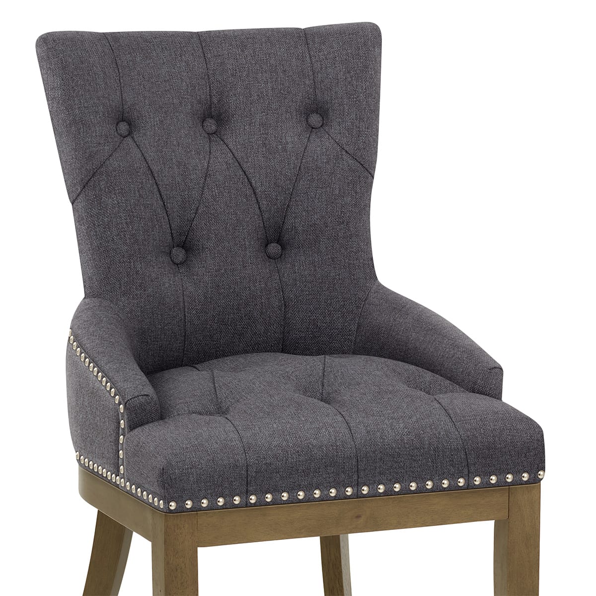 With beautiful button detail adorning the charcoal fabric seat, this design makes a real focal point. In addition, metal studs add to this ornate look. For comfort, the seat is equipped with a belted frame that makes for a sumptuous experience.