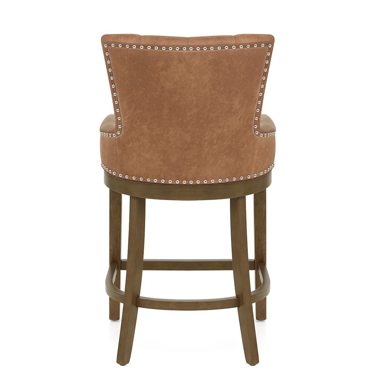 Upholstered in smooth tan faux leather, the generously padded seat is supported by a strong belted frame for reliable comfort. The tall backrest curves gently around the seat, offering a sense of support and enclosure, while deep button tufting adds traditional flair. Finished with a row of metal stud detailing, it makes a sophisticated statement from every angle.
