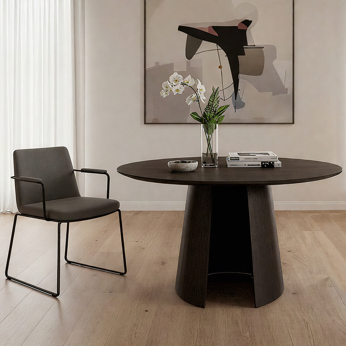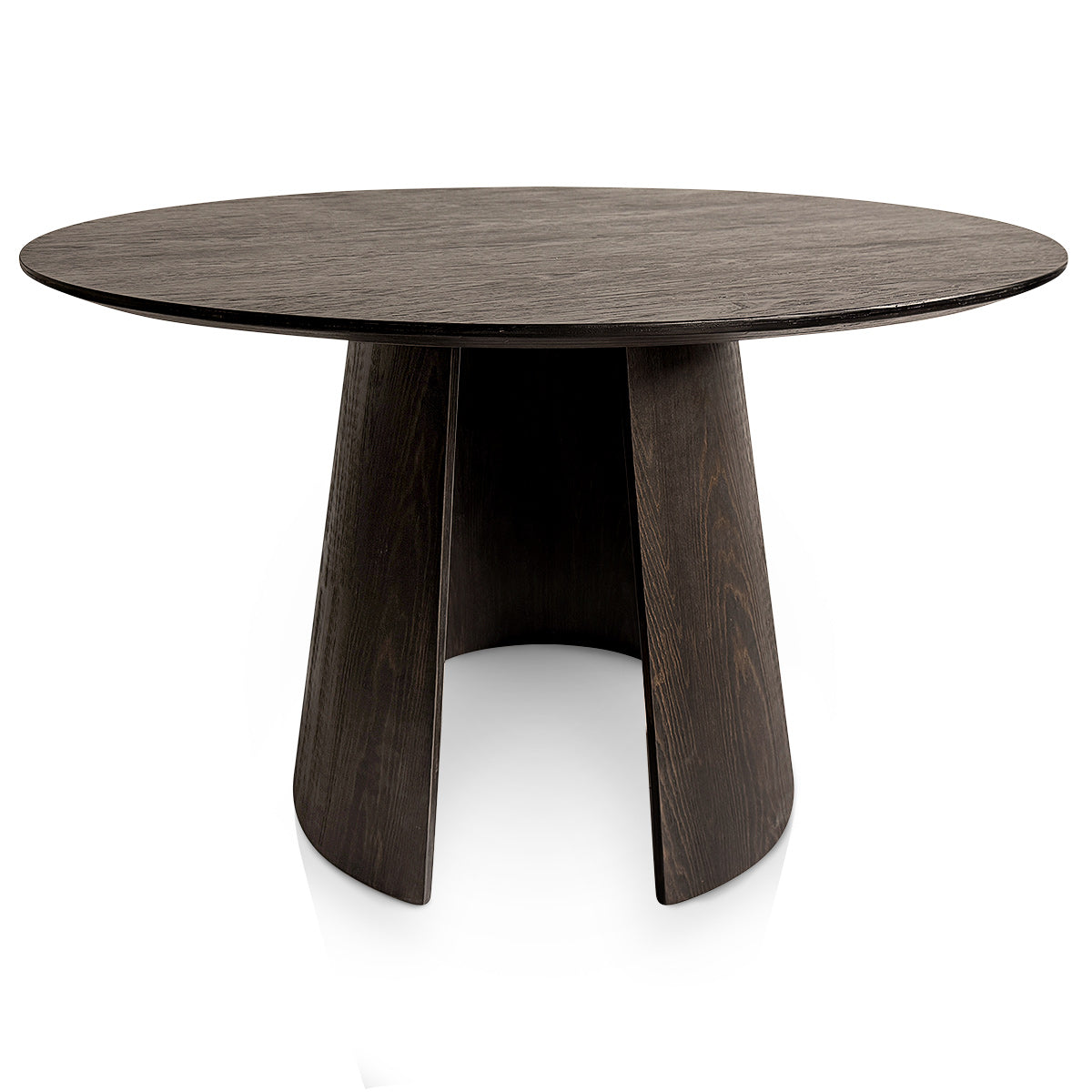 Expertly made from robust dark wood, the round 120cm tabletop commands attention with its substantial presence. The streamlined edge lends a refined contour, balancing its strength with subtle elegance. Its dark, polished finish highlights the wood's natural grain, providing a surface that is both durable for daily dining and striking enough for formal occasions.
