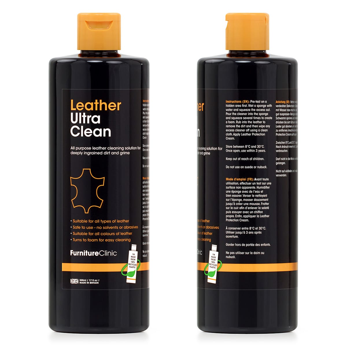 This kit contains 2 x 500ml bottles - a Leather Ultra Clean and a Leather Protector Cream plus 1 Applicator Sponge and 1 Cleaning Sponge. The foam cleaner will effectively remove any stubborn marks or dirt, whilst the protector will inhibit the absorption of oil or water-base liquids which might be accidentally spilt. It is not recommended for use on Suede or Nubuck.