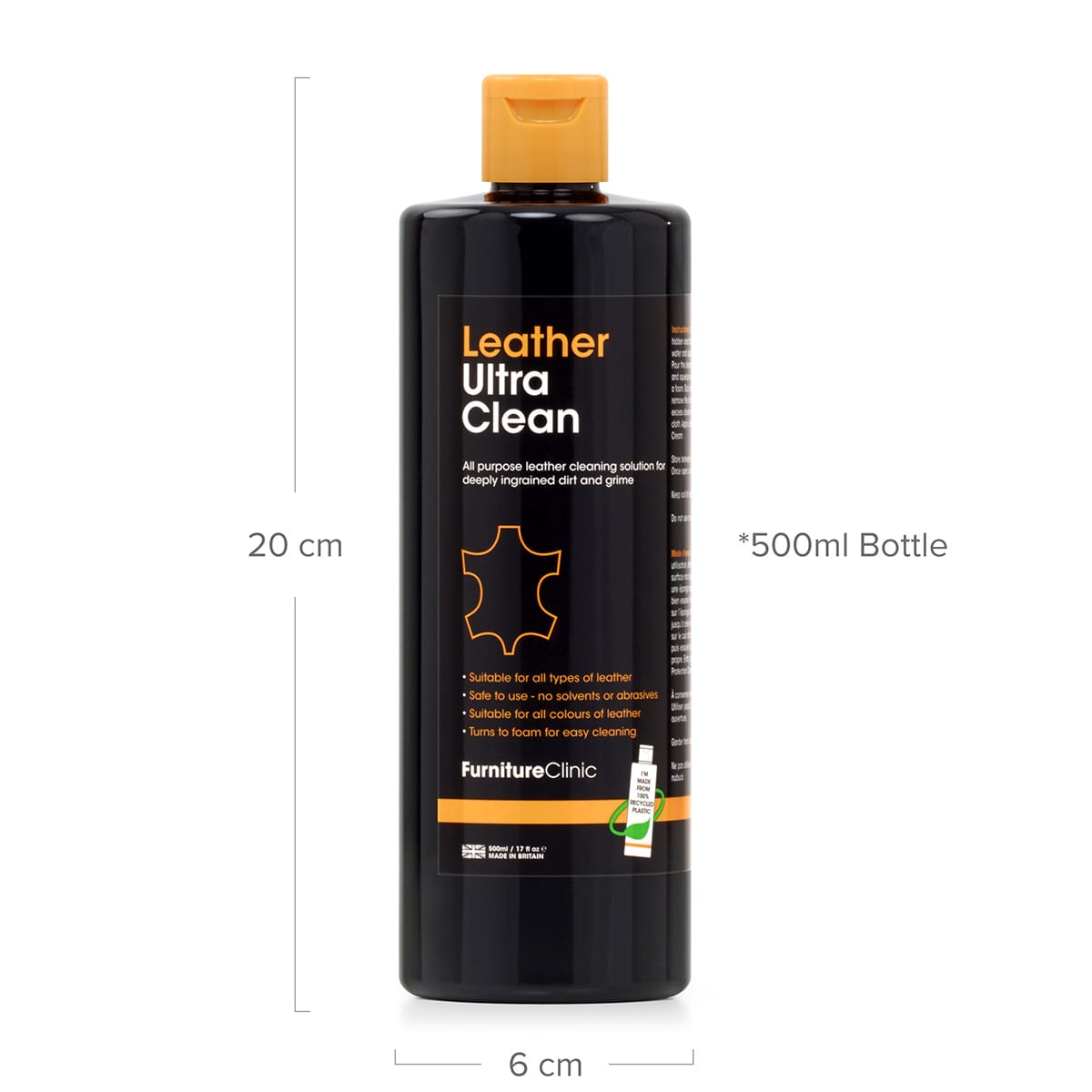 The 500ml bottle contains a water-based solution, which penetrates deep into the surface of the leather and makes it ideal for use with all colours, from light to dark. The Leather Ultra Clean is also suitable for use with all types of leather, including faux, bonded and real leather. It is not recommended for use on Suede or Nubuck.