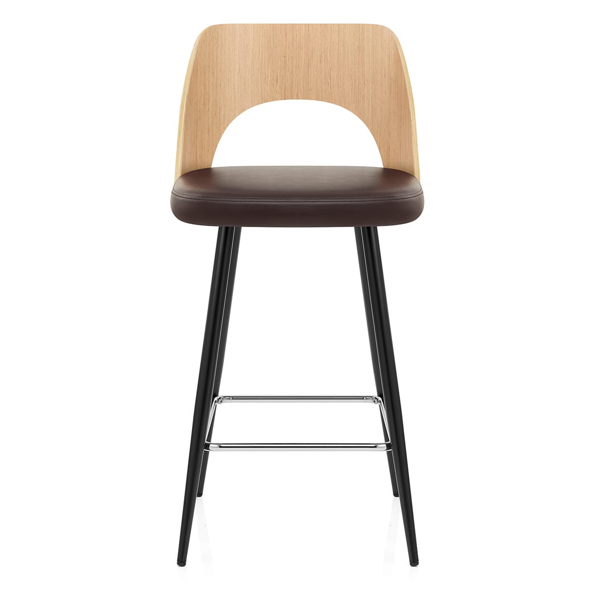 The seat features an oak finished bentwood outer seat shell, that provides a real aesthetic appeal. The high backrest is curved to provide ergonomic support and comfort whilst seated and also has a central opening in the lower back that makes a real visual statement. To enhance comfort, the seat is cushioned with a brown faux leather pad and is nestled into the bentwood shell.