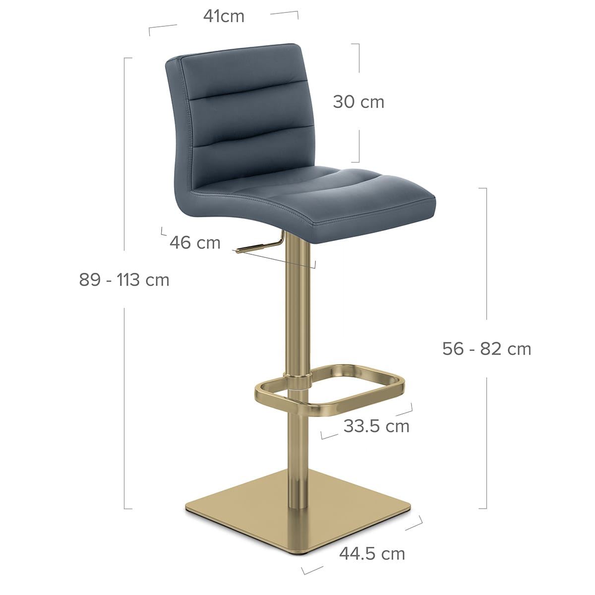 The serenity of the blue seat is underlined by the steel frame, finished with an opulent brushed gold. This frame includes a gas lift, allowing for adjustable height and 360 swivel, a sleek footrest, and a weighted base. On the underside of the base, felt floor guards work to keep your floors safe.