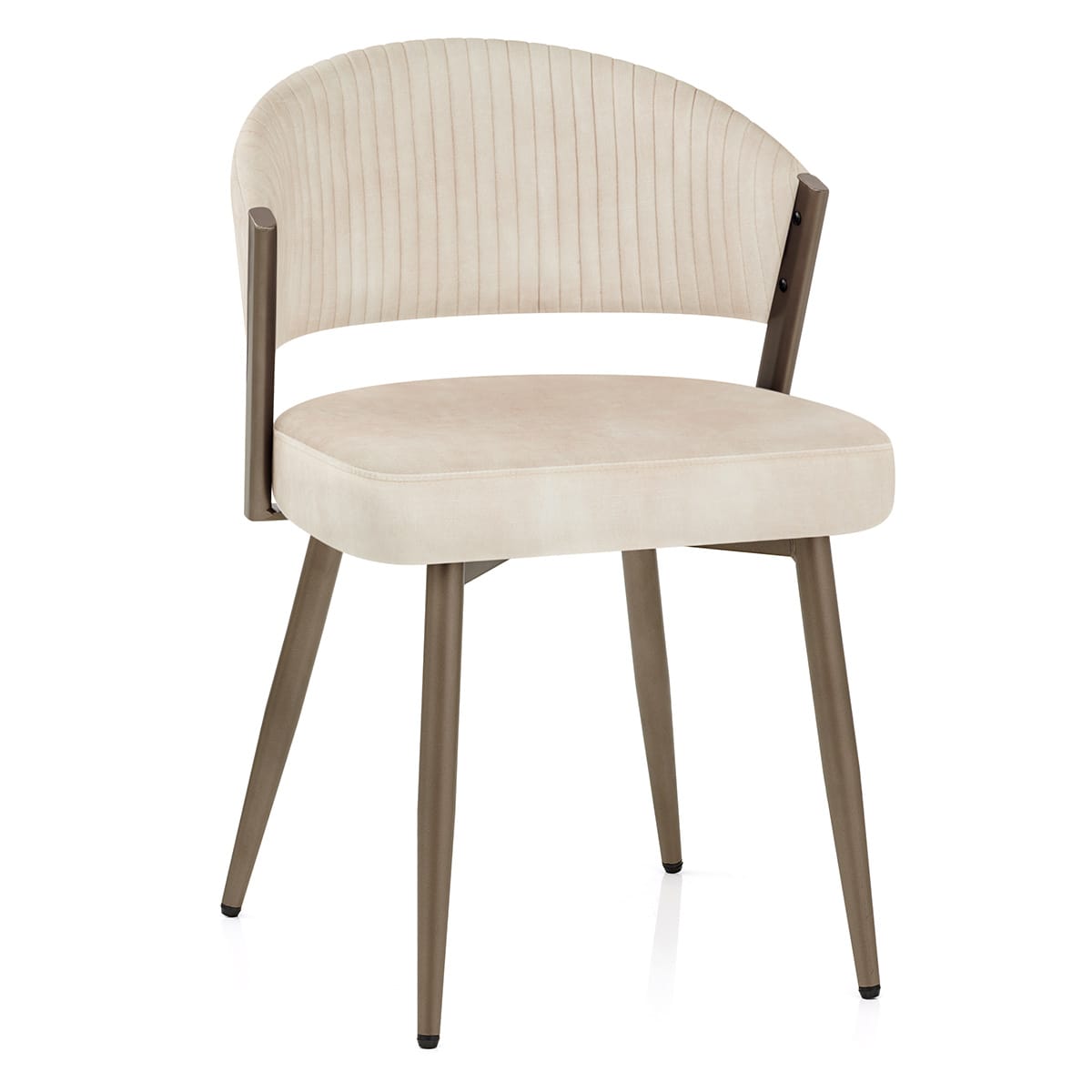 Sturdy cylindrical legs support the seat from below, matching the seat struts and complimenting the velvet colour with its antique bronze finish. Near the floor, the legs narrow, adding to the silhouette of the chair. Finally, to assist in keeping your floors healthy, protective adjustable floor plugs have been installed at the ends.