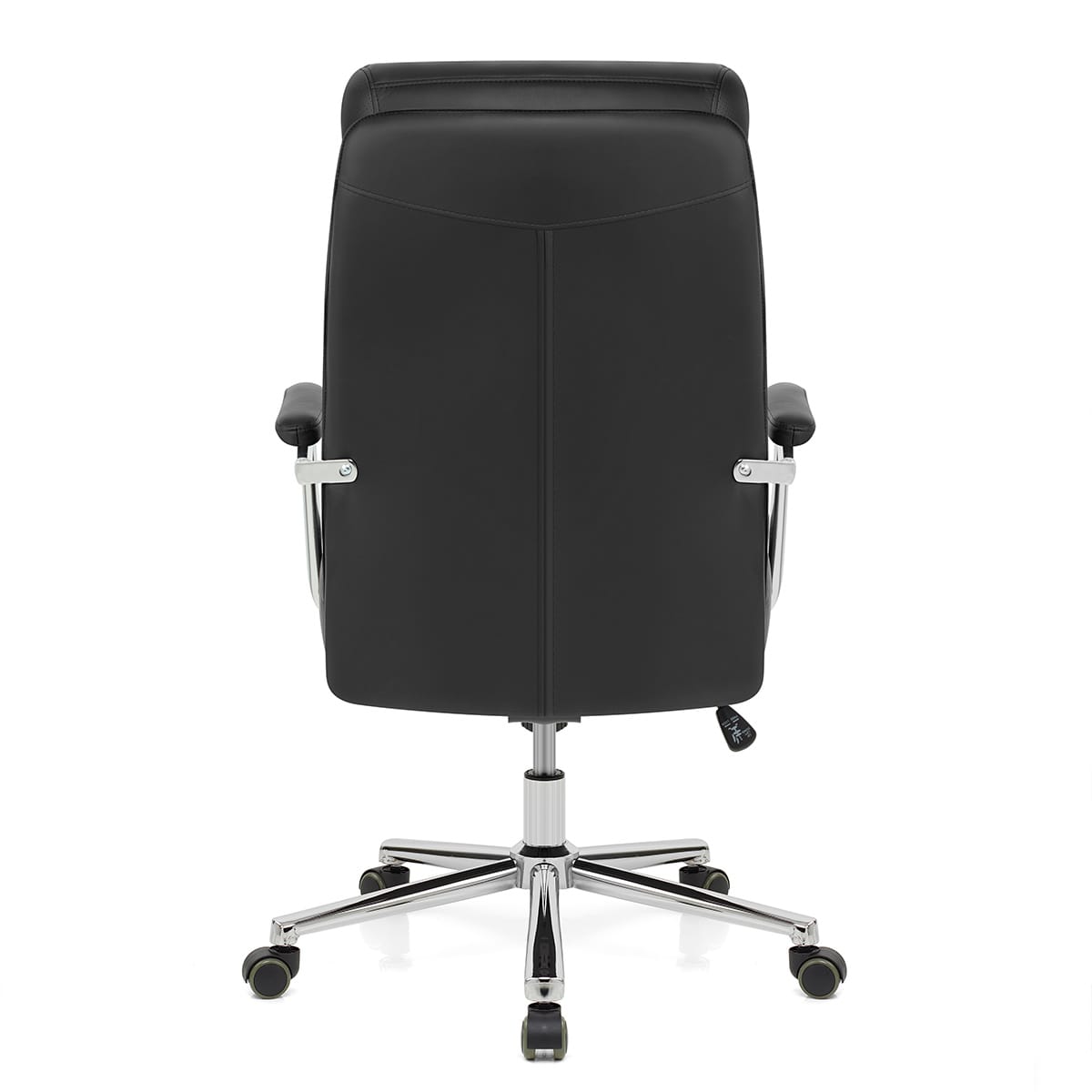 Triple segmented and double layered, the tall backrest has been designed for optimal support. It matches the seat pad with its black faux leather upholstery, additionally connecting with it through the stylish chrome arms. These are equipped with a faux leather layer on top, padded for convenience and comfort in equal measure, swooping down at a right angle, they grant space to move closer to the desk.