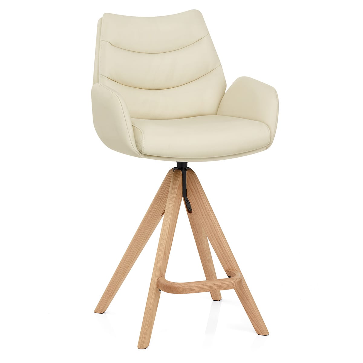 Crafted from solid oak, the wooden frame supports the seat with four wooden legs in a pyramid formation. This frame also allows for swivel and auto-return to its original position, allowing the stools to stay in a tidy arrangement. Reinforcing the front two legs is a distinctively curved shaped bracing bar, acting as a footrest. Each legs uses protective pads to help safeguard the floor.
