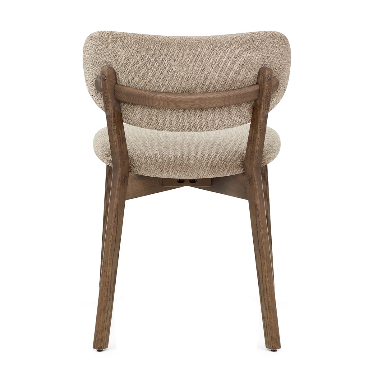 Sculpted for support, the two-piece padded seat invites comfort with every sit. Upholstered in a durable woven tweed fabric, its oval backrest gently curves to the user's form. Framed at the rear by sculpted oak, this feature adds visual interest and a tactile connection to the chair's solid structure and craftsmanship.