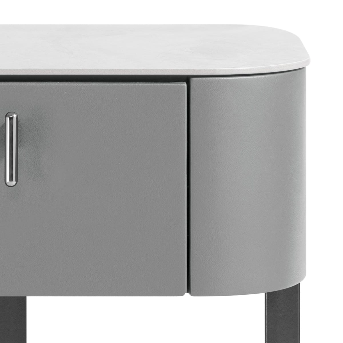 Covered in grey faux leather, the cabinet houses a spacious drawer, opened using a gunmetal finished, vertical handle. Using glazed, sintered stone for the topmost surface reduces risk of stains or damage, while boasting a calacatta-like pattern. These contrasting textures not only add more depth to the table, but also add a range of practical benefits.