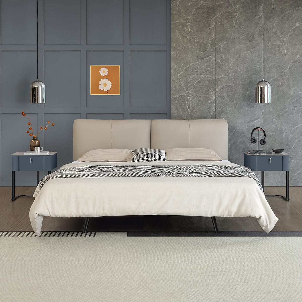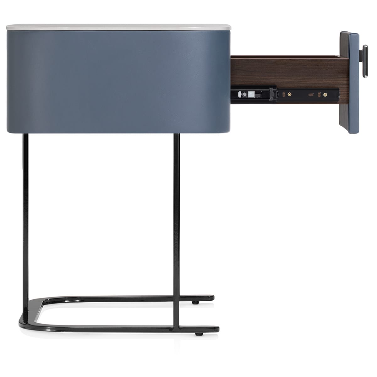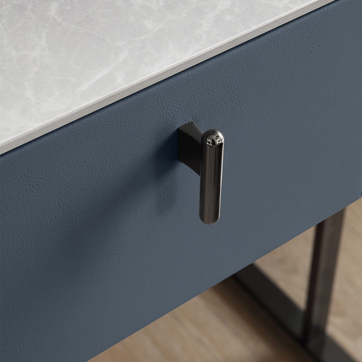 Curved in shape, the body of the bedside table is elevated from the floor and upholstered in navy blue faux leather. It homes a spacious drawer, opened by a metal handle at the centre. The top face is formed of glazed, sintered stone, creating a Calacatta pattern while boasting a surface that is highly resistant to stains and scratches.
