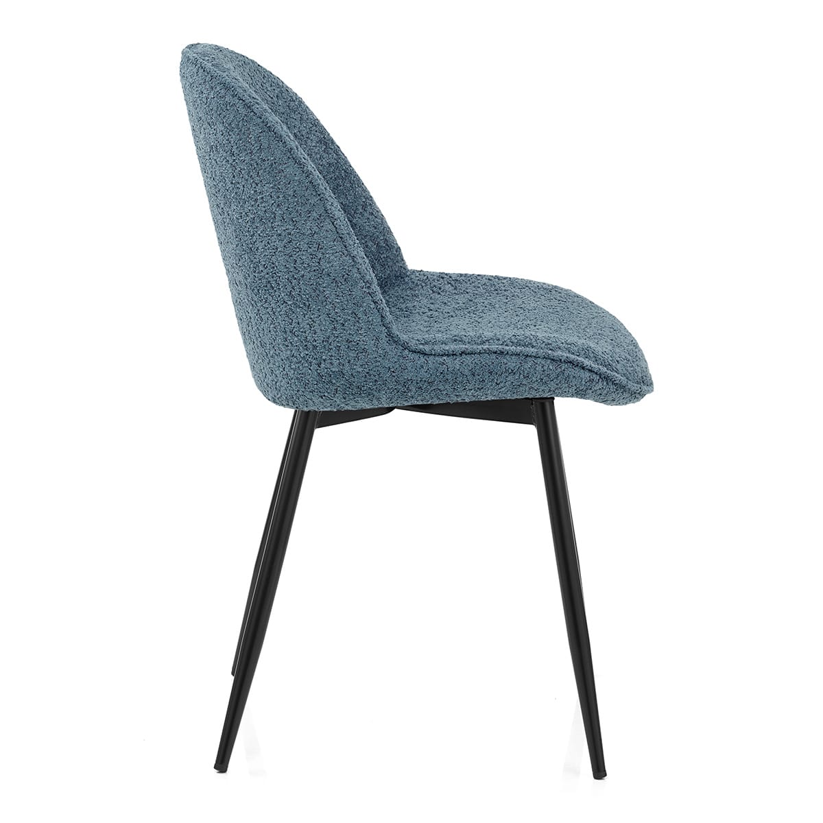 A luxurious seat covered in a blue boucle weave fabric, offers a tactile and soft feel. Well-padded throughout, it ensures maximum comfort for extended periods of sitting and comes with a medium height backrest, that offers support. The seat has a rounded shape, that gives it a contemporary and inviting appearance, it is then finished with piped edging that highlights curved outline. A fuzzy appearance to the fabric adds an inviting element.