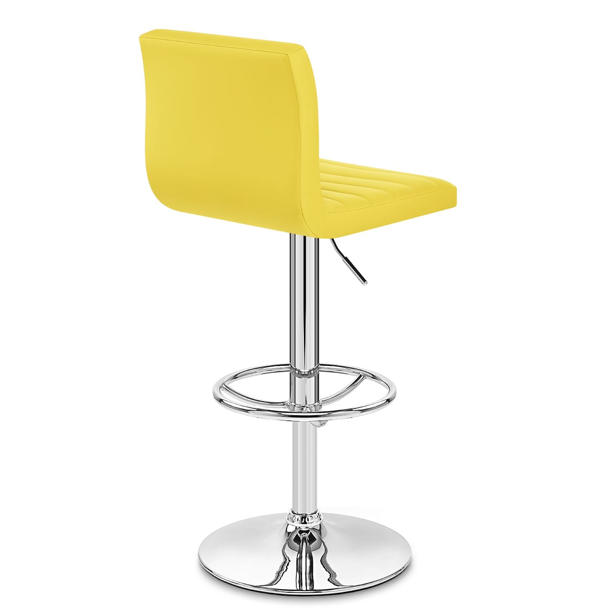 Upholstered in vivid yellow faux leather, the seat is comfortably padded and also has a medium backrest to offer first-class support. Horizontal stitching stylishly segments the seat, and contrasts with the round footrest and sturdy base below.