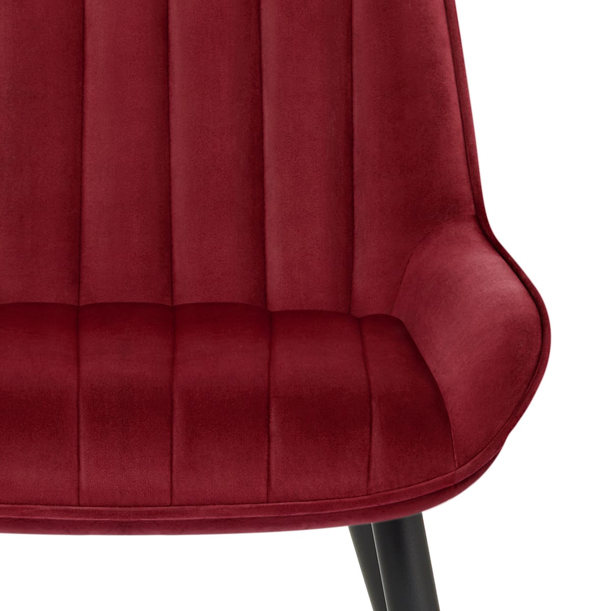 The impactfully rich shade of the chair's red velvet upholstery is even more striking in contrast with the darker frame beneath. A high backrest with vertical stitching progresses into winged sides, more smoothly finished than the rest of the seat and with piped edging for a graceful appearance. Meanwhile, the linear stitched detailing on the seat pad helps to emphasise its dense internal cushioning.