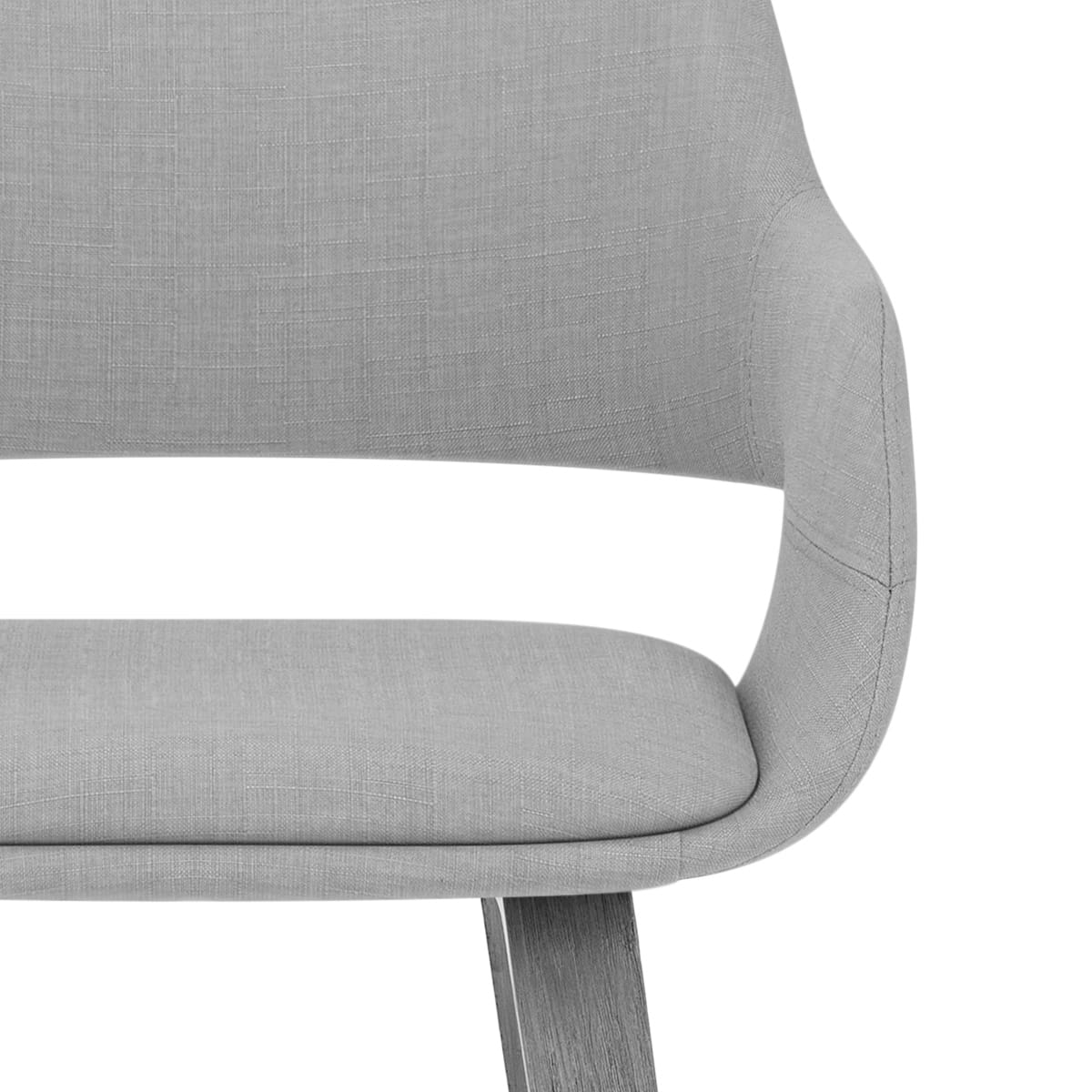 An encompassing seat includes a supportive backrest and arms, so that you can sit back and enjoy the stool's ample padding and grey fabric upholstery. The curved open section at the rear of the seat, and stitched lines on the armrests, allow for a uniquely refined aesthetic. A bentwood underside affords an additional, rustic complement.