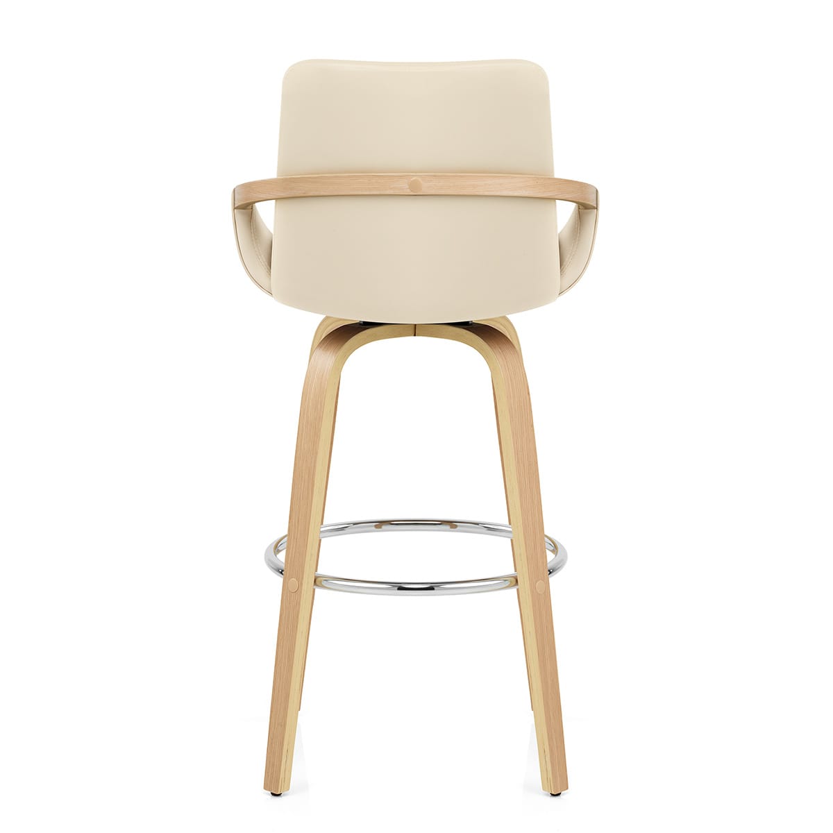 The padded cream faux leather seat creates an elegant design that provides superior levels of support. The high backrest cleverly curves to the body's shape, and both backrest and seat pad are set within an outer faux leather shell for additional comfort. An oak bentwood wraparound bar leads into triangular side winglets that provide a reassuring and encompassing structure.