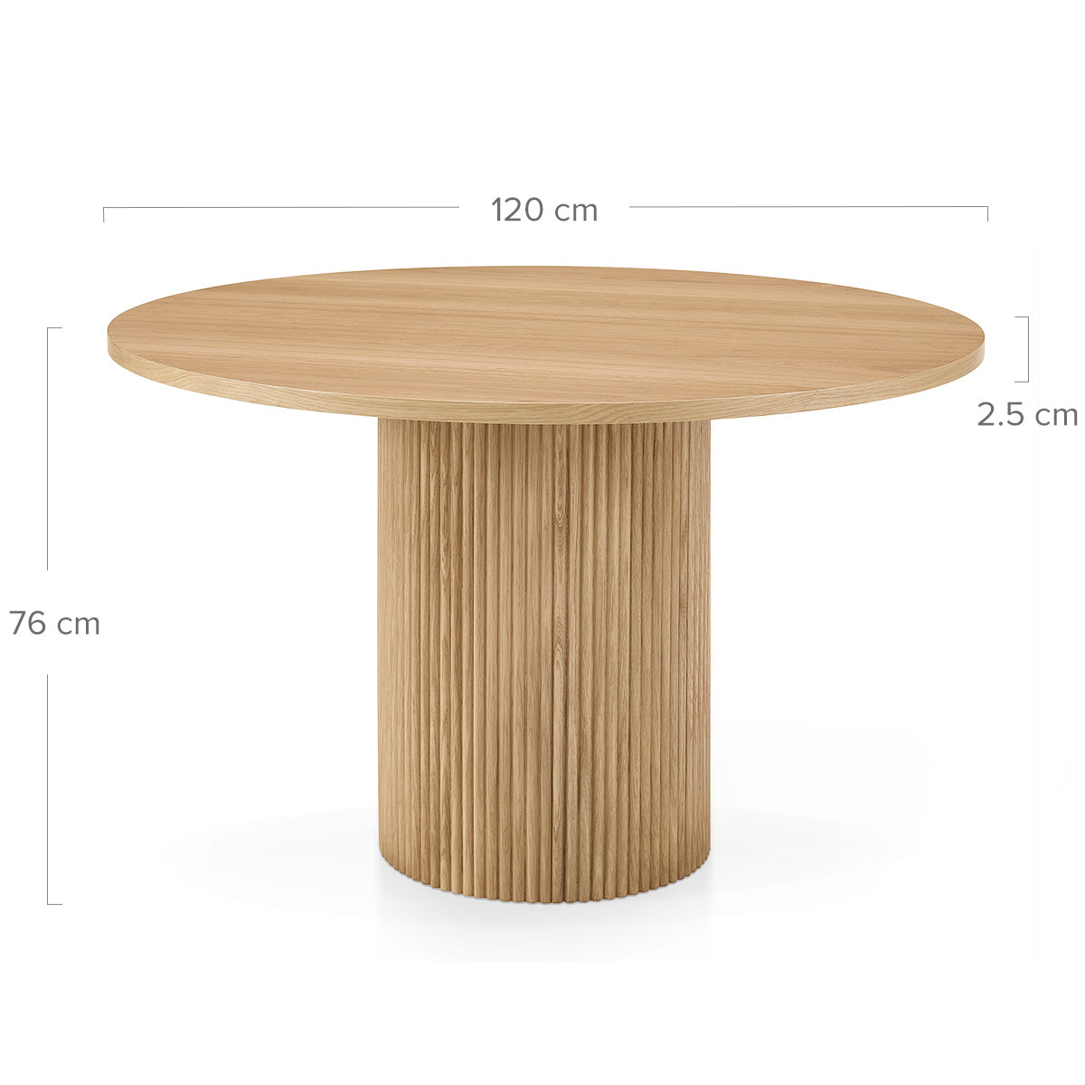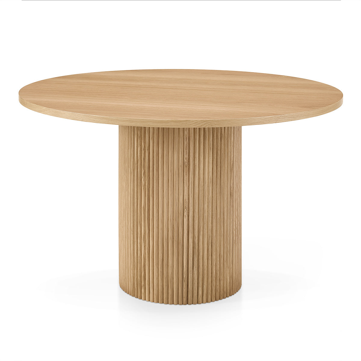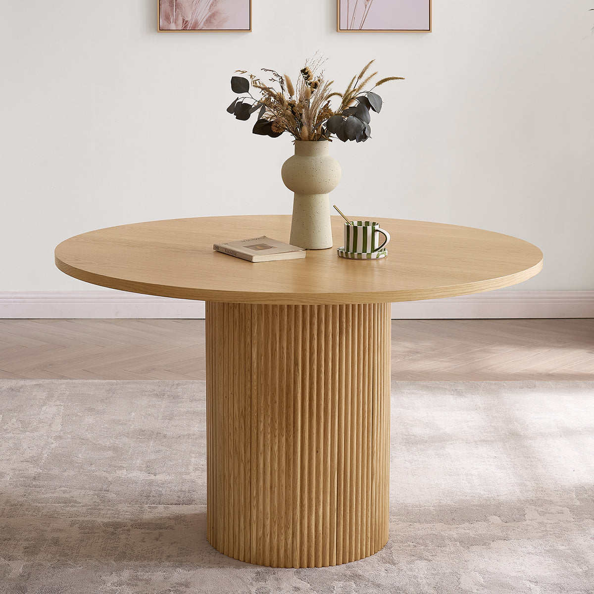 The pedestal base is beautifully constructed from oak-veneered wood, designed to provide both stability and sophistication. Featuring a vertical fluted pattern, the cylindrical column adds texture and visual interest, complementing the smooth tabletop. The streamlined base not only maximises legroom but also enhances the Scandi-inspired aesthetic. Fitted with protective pads, it helps ensure your floors remain scratch-free, making it as practical as it is stylish.
