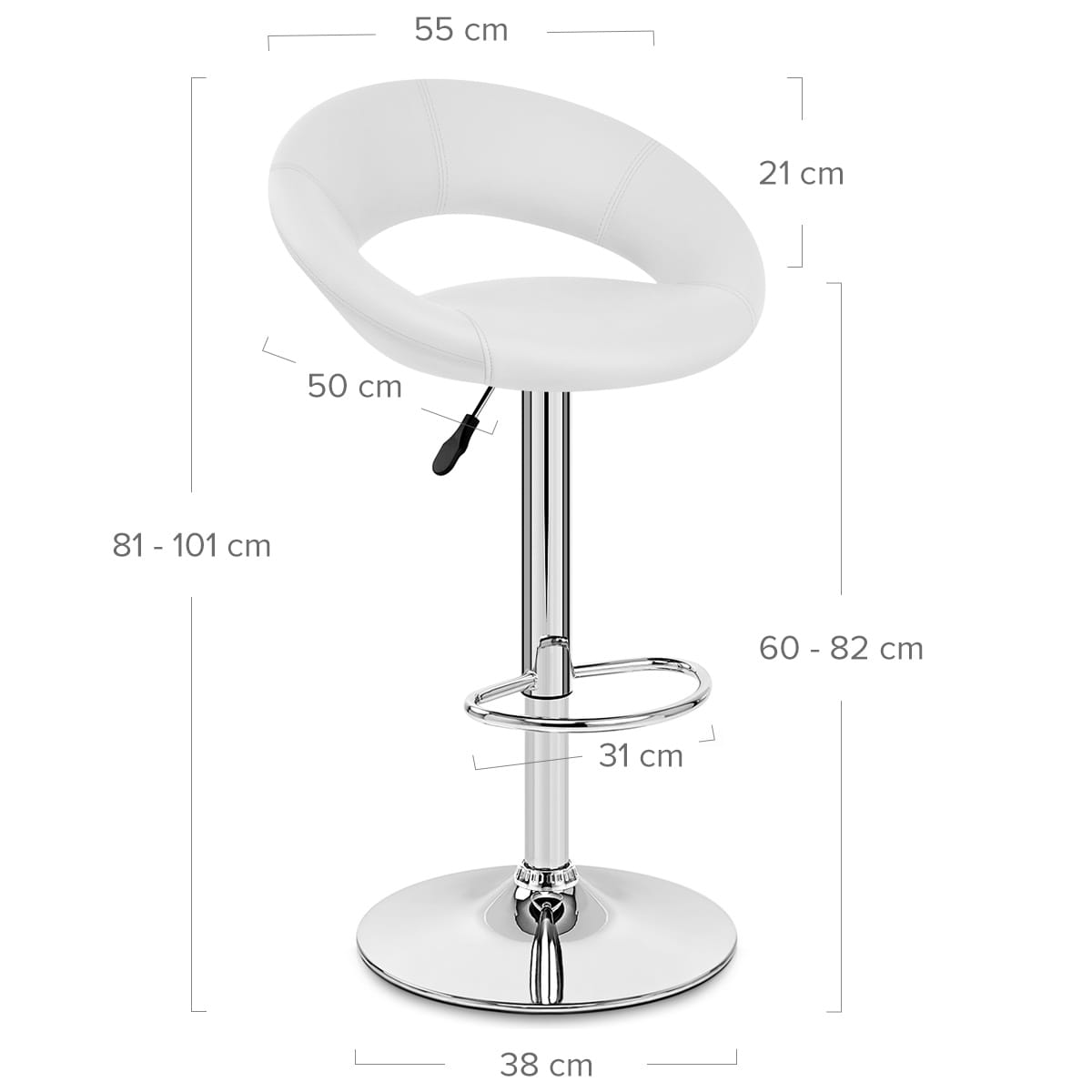 The seat sits on a slender chromed stem, on which is a hand fashioned footrest, crafted from chrome plated tubular steel. An adjustable height gas lift and 360 degree swivel mechanism give superb functionality, which with the sturdy circular base gives the Padded Crescent even more desirability. The base comes with a rubber ring beneath to help keep your floor free from scratches and makes this stool a well thought out choice.