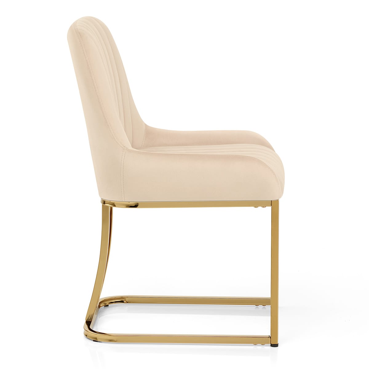 Upholstered in a luxurious, champagne velvet, the seat and the high backrest are plush and padded for your comfort. Both are also accented with stitched, vertically patterned detail that adds more visual depth. Around the seat pad, the two sides of the chair are gently elevated to provide assurance and security to those seated on it.