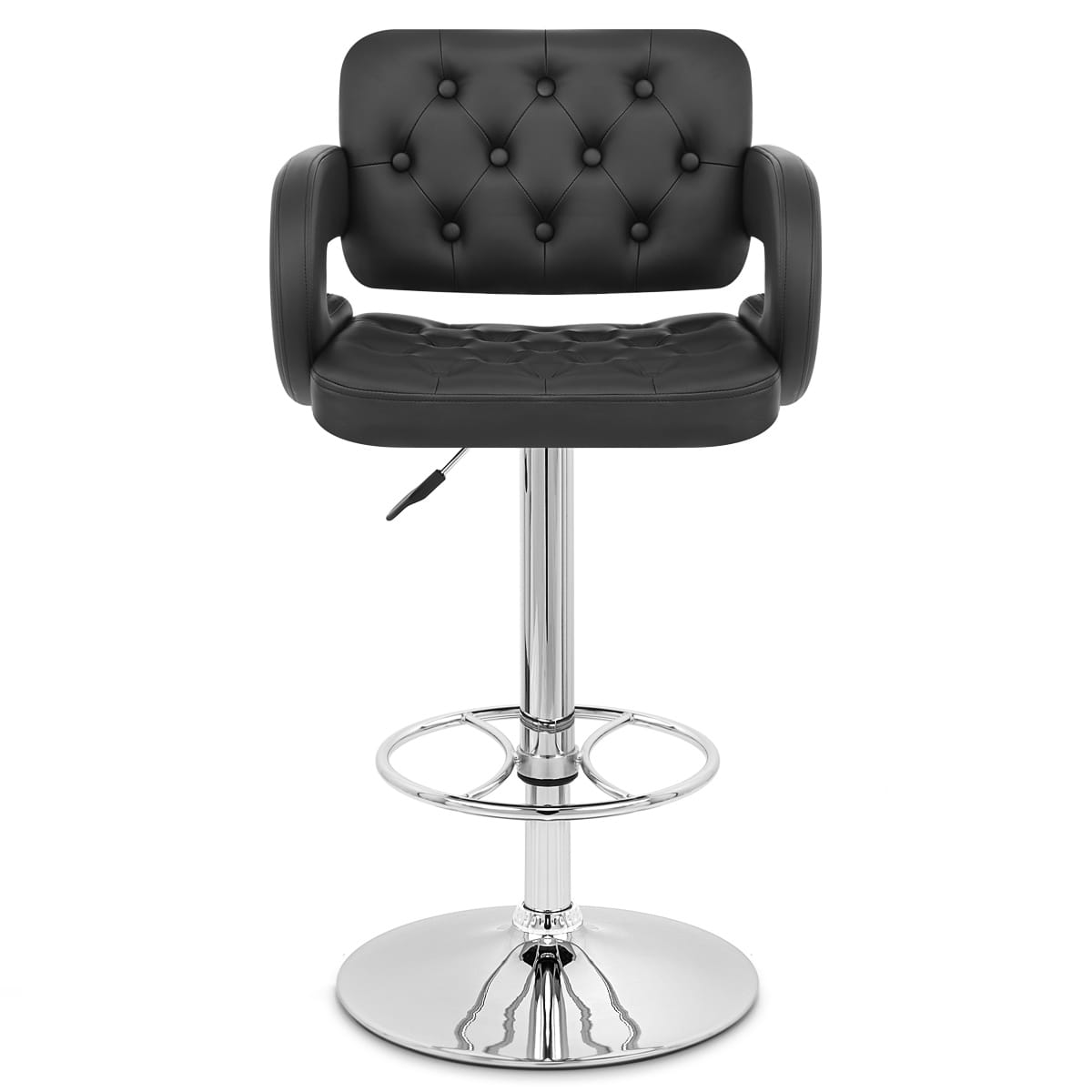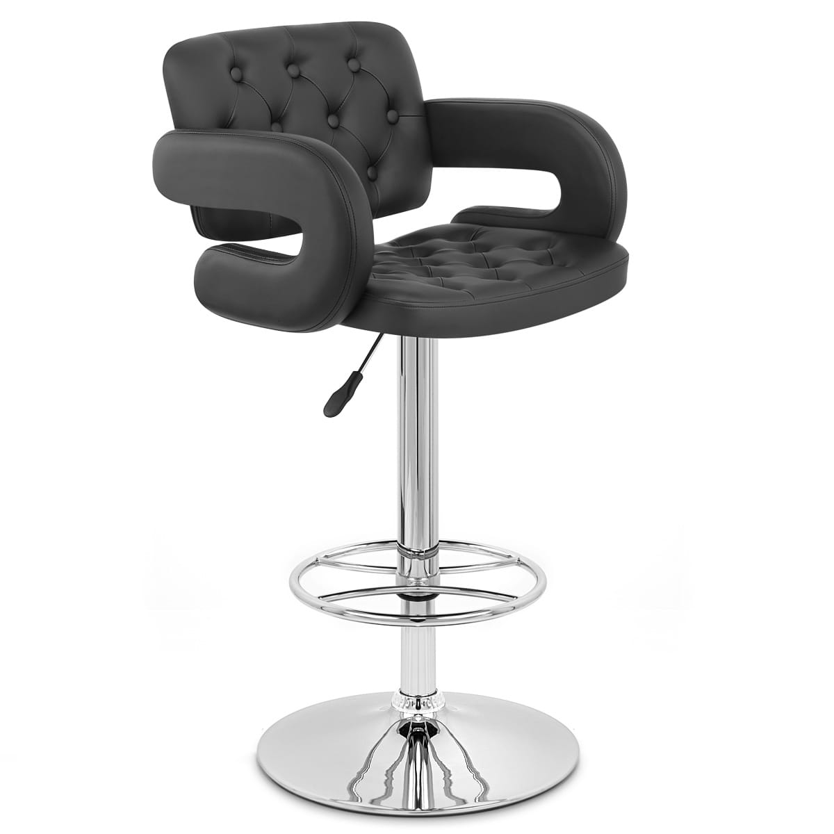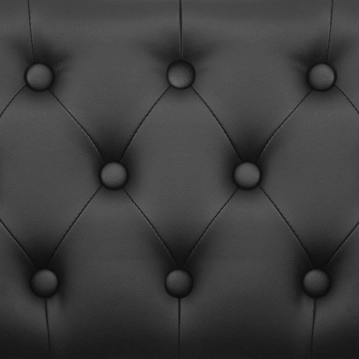 The comfortable padded seat is covered entirely in black faux leather, and has dynamic C-shape armrests to either side, giving further impact. The cushion and supportive backrest are detailed with buttons stitched into the surface, giving a luxurious, quilted look reminiscent of a Chesterfield style armchair.