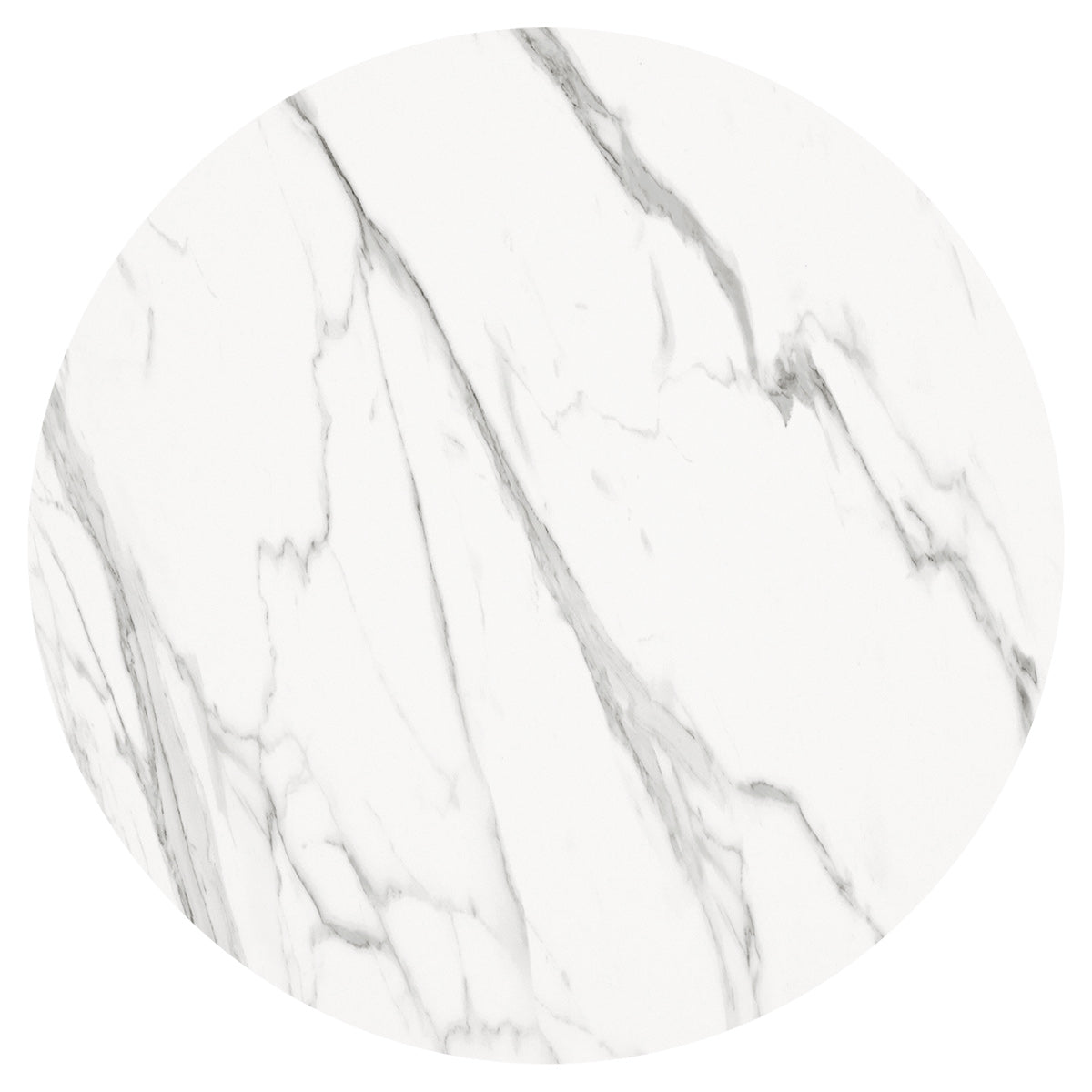 Measuring 90cm in diameter, the surface of the Poseidon's circular tabletop has a build that balances form and function. It features a stunning 12mm white ceramic surface, traced with subtle dark grey veining, that adds depth and elegance and beautifully completes the design. Durable yet graceful, it delivers a polished finish suitable for everyday dining for up to 4 chairs.