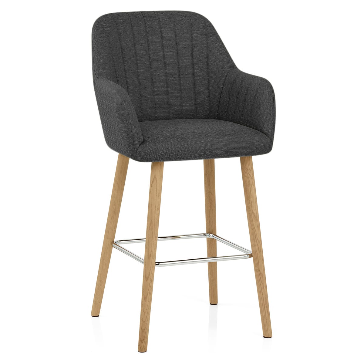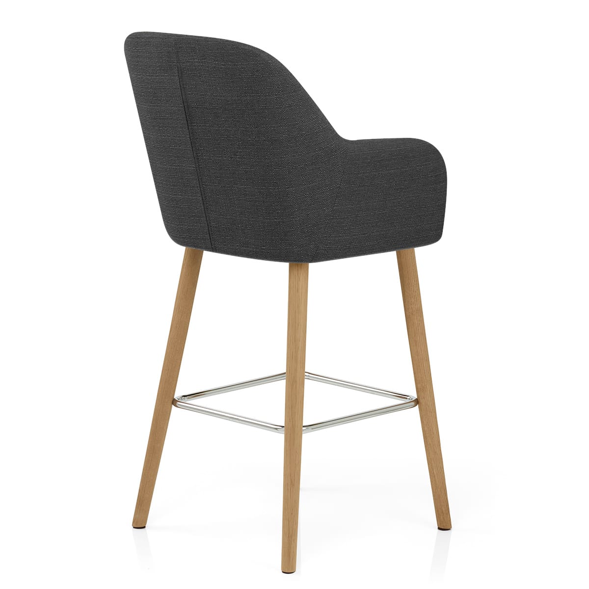 Underneath the seat is a solid wooden frame, standing at fixed kitchen bar height. Four legs in a beautiful oak finish are braced and juxtaposed with a polished square chrome footrest. As they taper downwards, the rounded legs give way to protective floor pads that aid in the prevention of scratches.