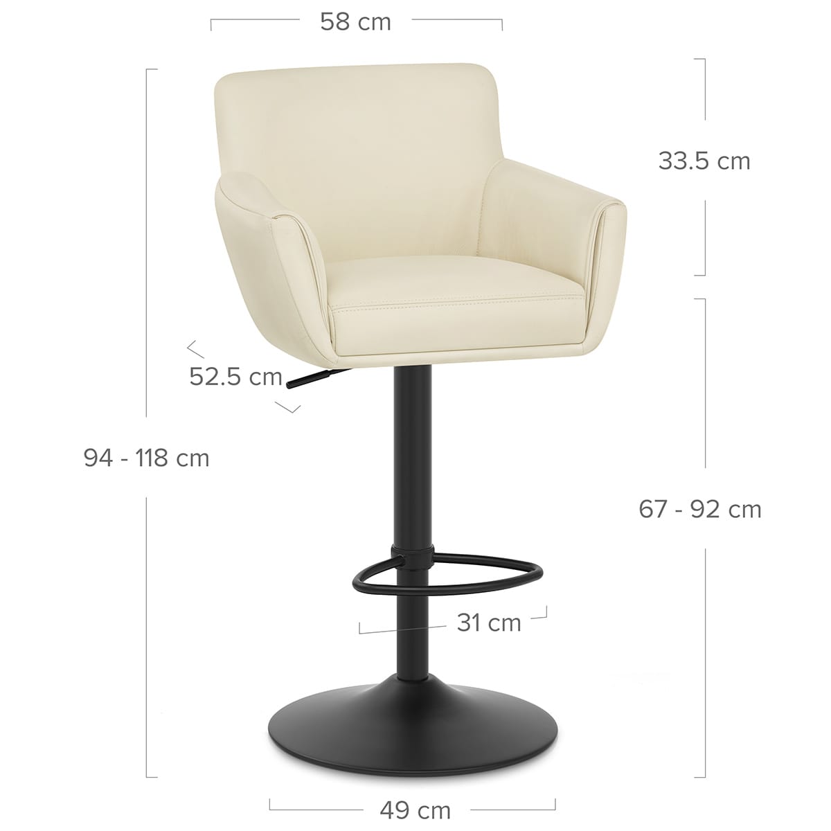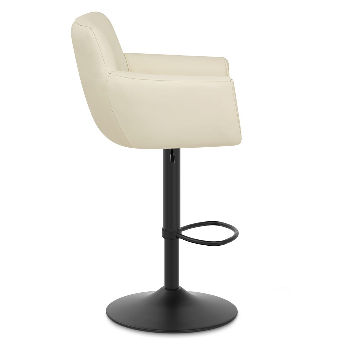 Using strong metal with a black powder coated finish, the gas lift grants you access to functions such as an auto return swivel and modifiable height. Sitting below the seat is a semi-circular footrest, stylish in shape. To keep the stool stable, the base is sturdy and round. For added protection against marks to your floor, a ringed floor protector surrounds the underside of this base.