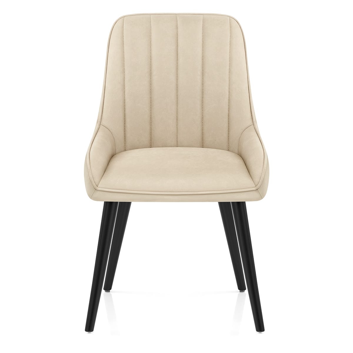 Wrapped in gorgeous beige faux leather, the cushioned seat and tall backrest offer both comfort and visual balance. Vertical stitched channels lend depth and texture, while the gentle side contours create an inviting sense of support. Finished with subtle piping along the edges, the design feels tailored and timeless, making it equally suited to relaxed meals or refined dinner settings.