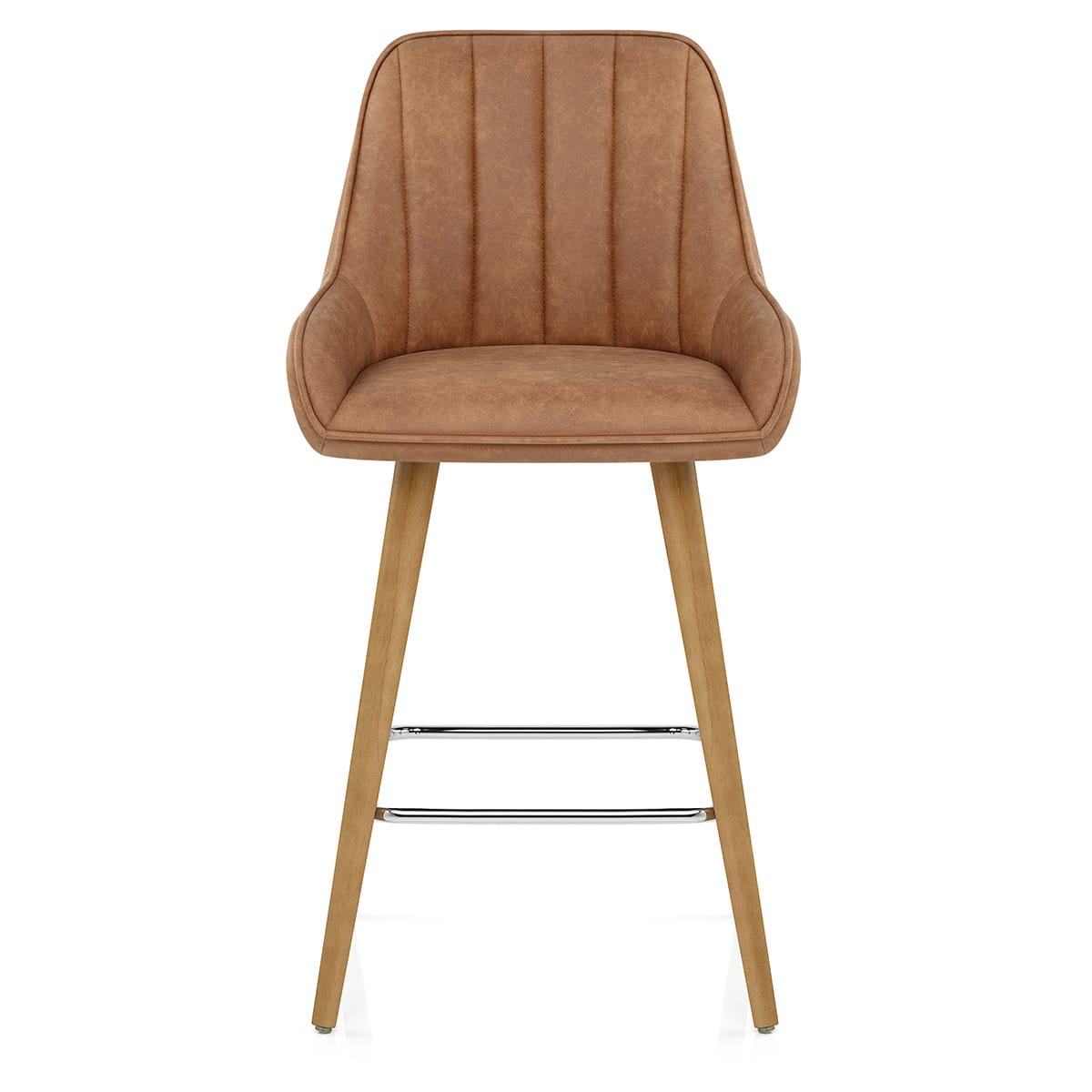 Built on four solid round legs with a warm oak finish, the frame offers reliable stability and graceful style. The legs taper gently toward the floor, giving a refined profile, while a lustrous chrome footrest in a rounded square shape adds contrast and comfort. With a fixed seat height and protective adjustable feet, it's designed to stay level and supportive on any surface.