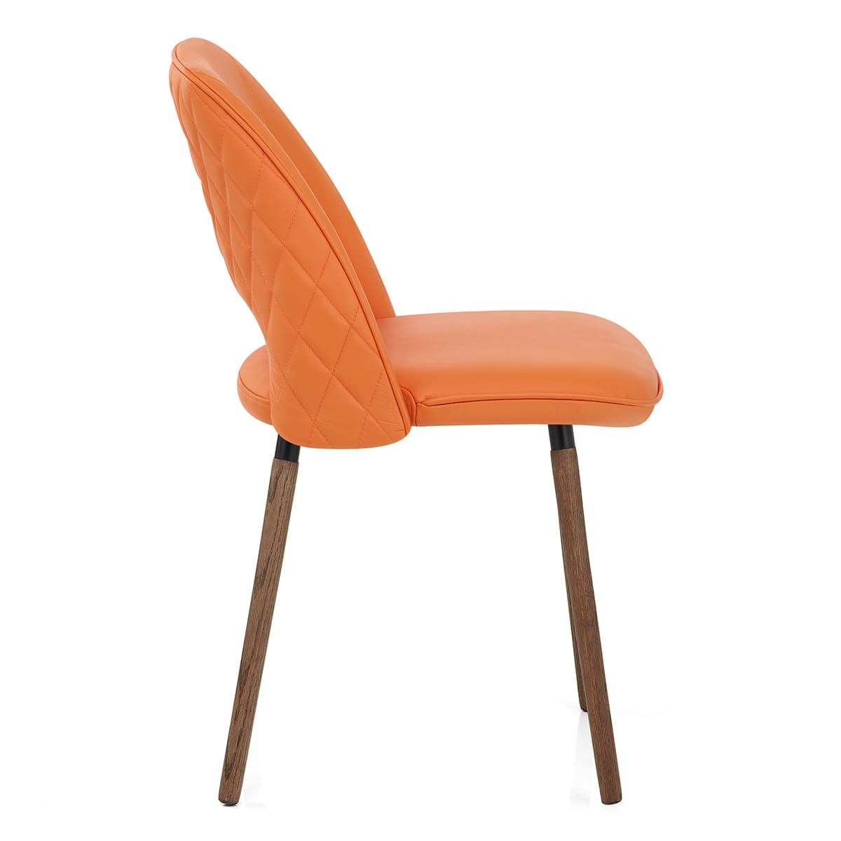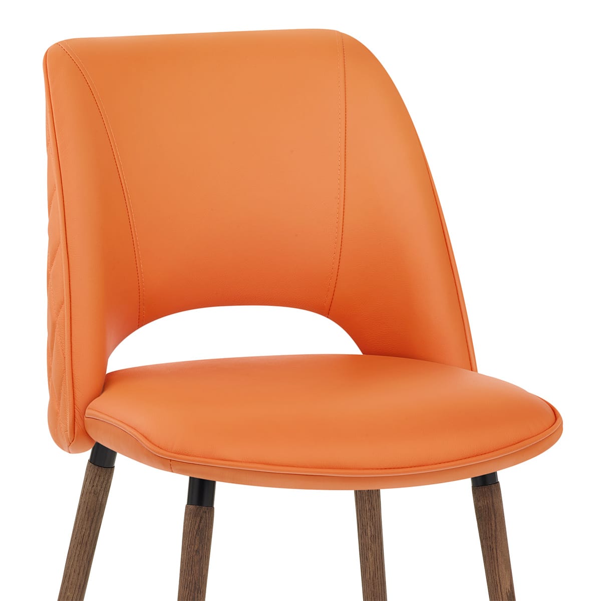 Padded and wrapped in supple orange real leather, the seat is designed for comfort and character. A tall backrest, with two lines of vertical stitching on the inside and diamond-quilted detailing on the outside, adds dimension. A sleek cut-out enhances styling and movability, making it perfect for busy kitchens or adaptable dining zones.