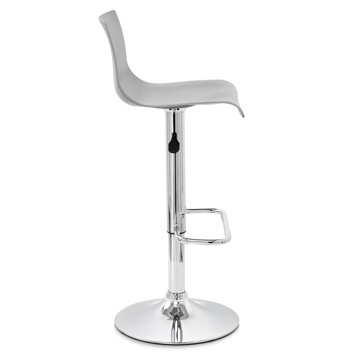 The seat rests upon a polished chrome frame, which can be rotated 360-degrees, complete with a rectangular footrest at the ideal level for your feet. The height can be easily adjusted thanks to a hydraulic gas lift. A robust rounded chrome base anchors the stem, with a rubber underside to help avoid damage to your floors.