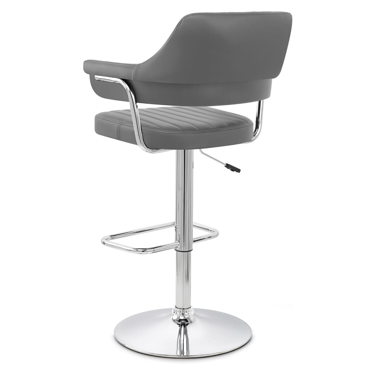 Stunning grey faux leather covers the seat and backrest, and the vertical stitch detail adds an exclusive feel to the design. This stool is as comfortable as it is stylish thanks to the dense padding throughout. Held upright by two chrome supports, the elevated backrest curves to create two armrests for extra support.