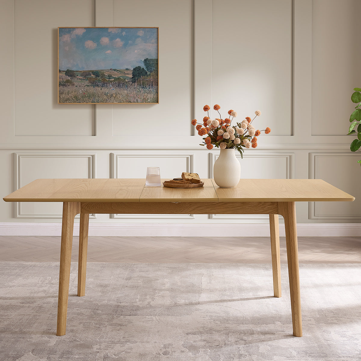 The Snowdon 140-180cm Extending Dining Table Oak combines up-to-date style with minimalist charm. Its streamlined profile and modest form make it a versatile addition to modern or classic interiors. Designed for everyday living, this table adapts effortlessly to your needs, offering both practicality and understated elegance in one timeless piece.