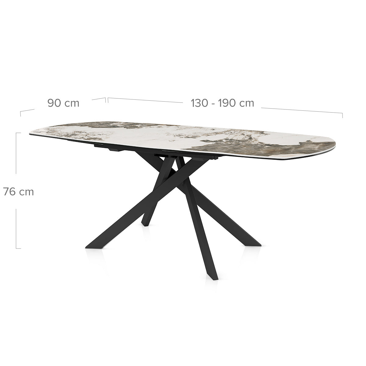 Seating 4 to 6 people with style and ease, the tabletop is constructed with a 6mm ceramic layer in a creamy beige Pandora finish, topped with 6mm glass. Shaped in a softly rounded rectangle, the length begins at 130cm but can be easily extended using an ingenious integrated swivel mechanism. Simply rotating the surface glides hidden extensions in to place, giving you a new length of 190cm.