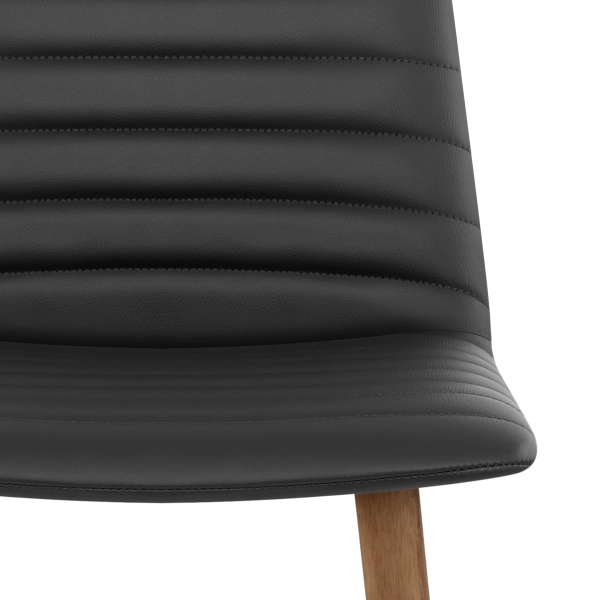 The padded seat is covered in black faux leather, which emphasises the contoured shape of the pad and high backrest. Horizontally stitched detailing segments the padding and provides a supportive, comfortable feel while sitting at your bar.