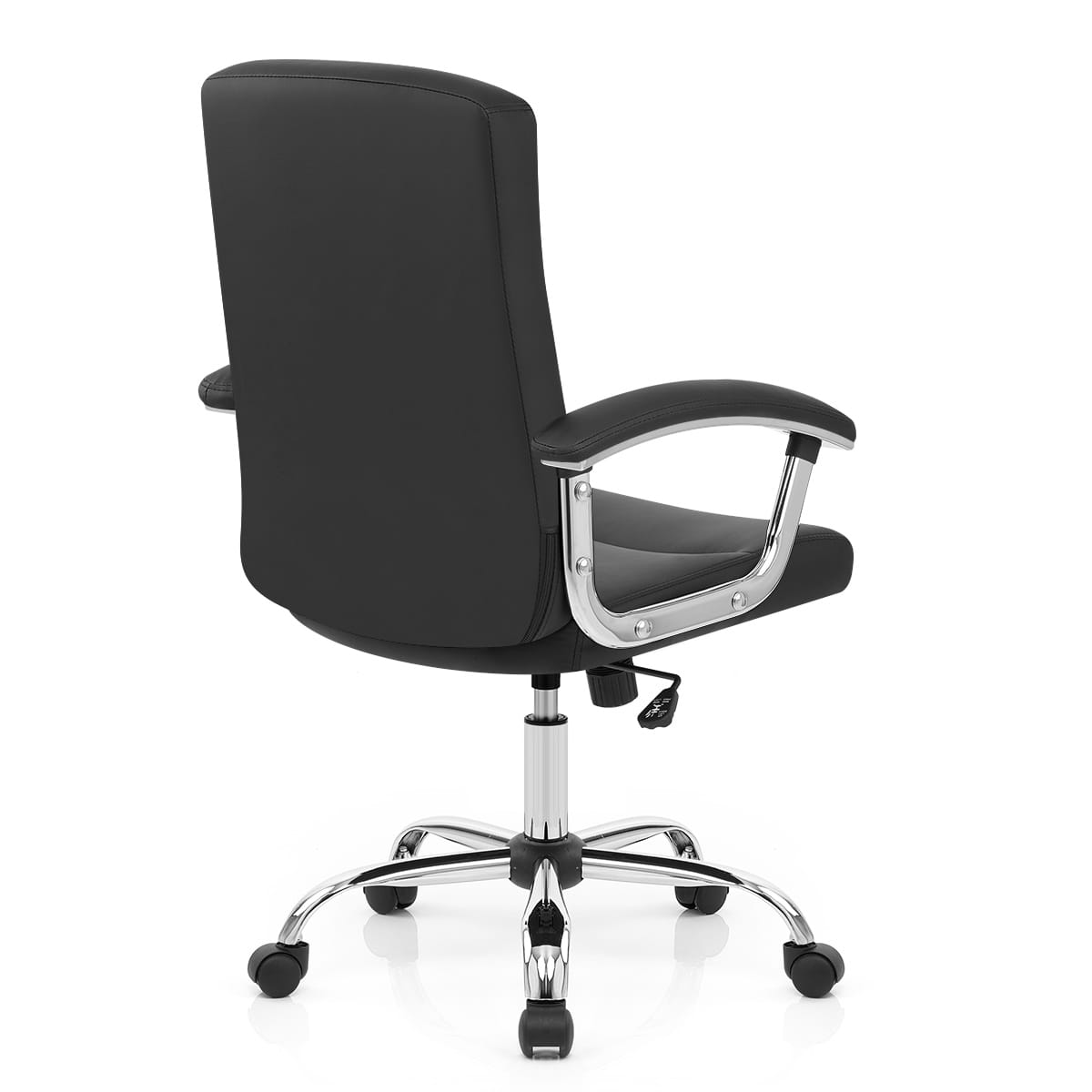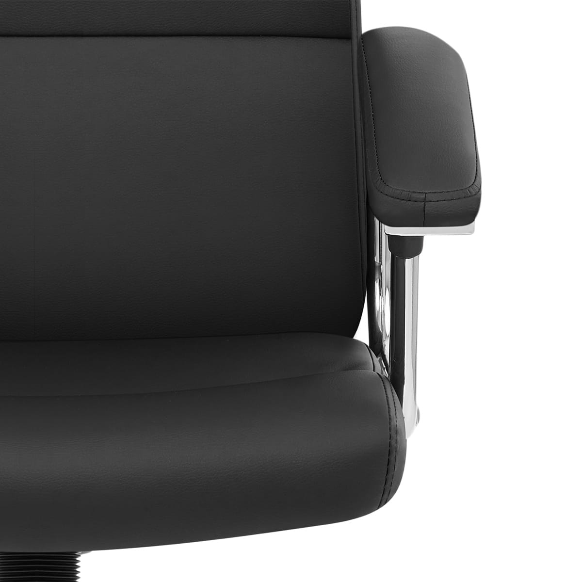The black faux leather seat is padded for comfort, its high backrest divided into 3 stylish segments with added lumbar support. Polished chrome armrests strike a beautiful contrast and are perfectly padded for a supportive perch for the arms. Plus they taper downwards at the front to help the chair slide easily under the desk.