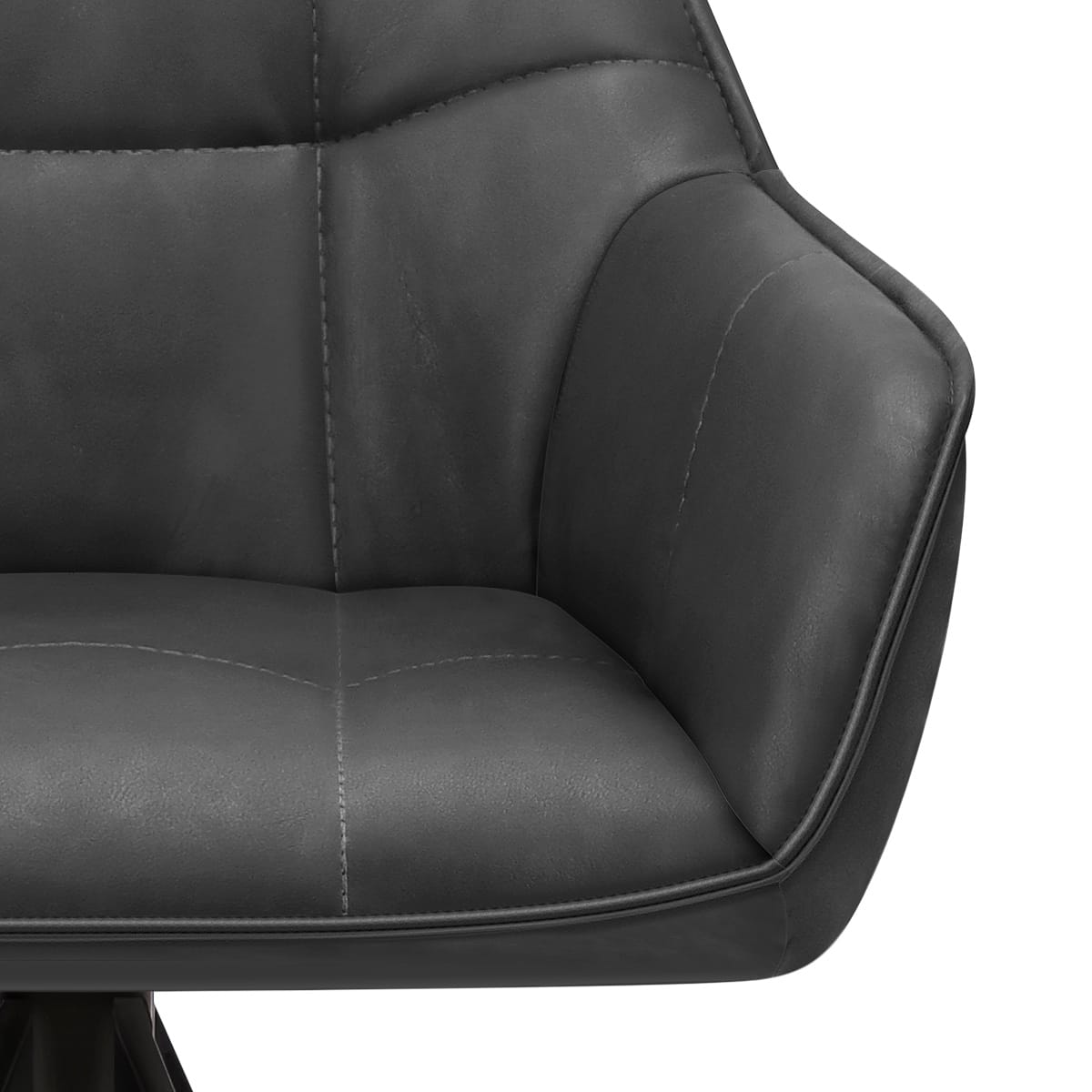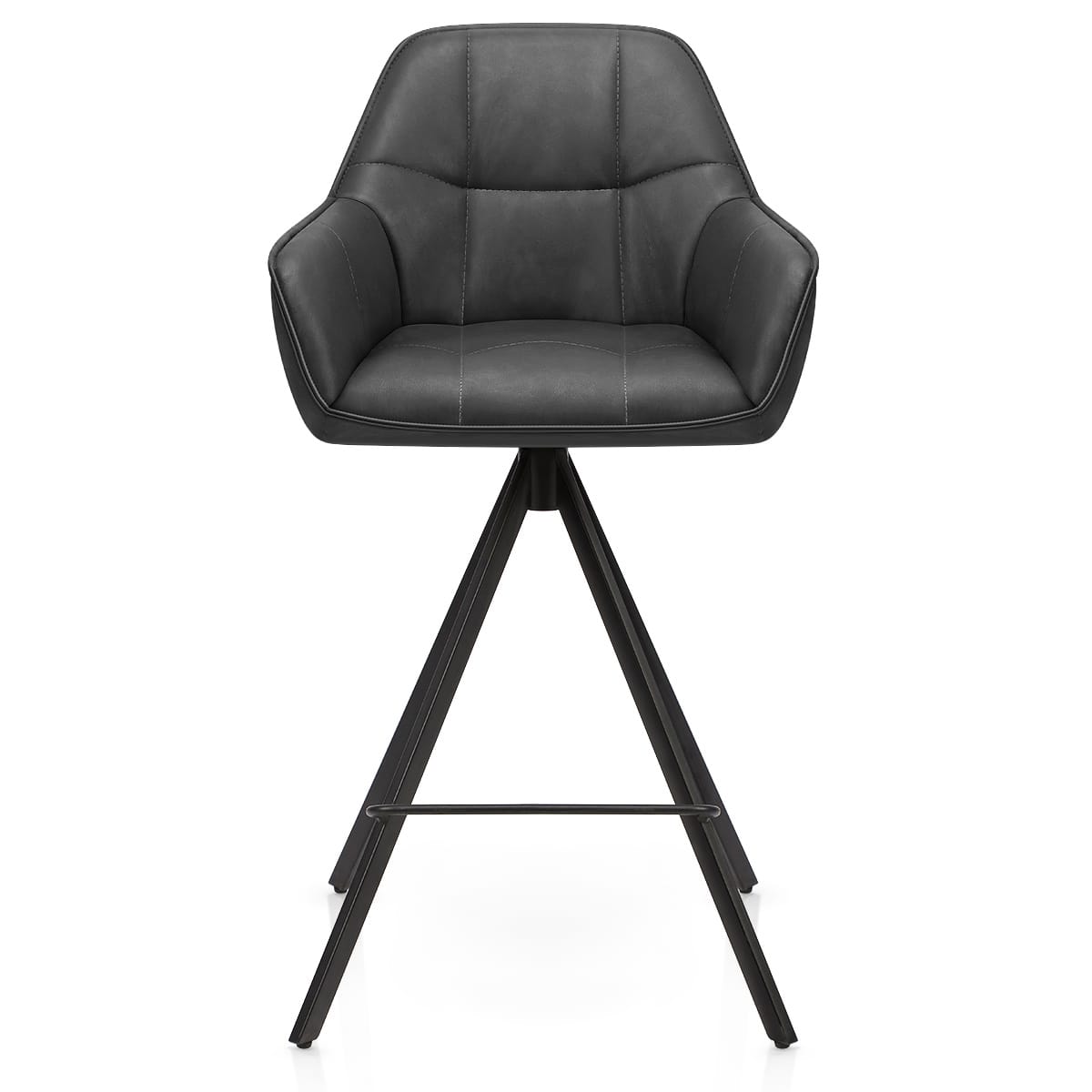 Covered with charcoal faux leather, the seat lifts familiar features from armchairs like the reassuring arms and the tall, supportive backrest. Along the edges of these and the thickly padded seat pad is decorative piping, and at the back of the backrest is a handle, allowing for easy relocation or turning of the stool. Similarly, the front facing sides of the seat are stitched with a grid pattern for detail.