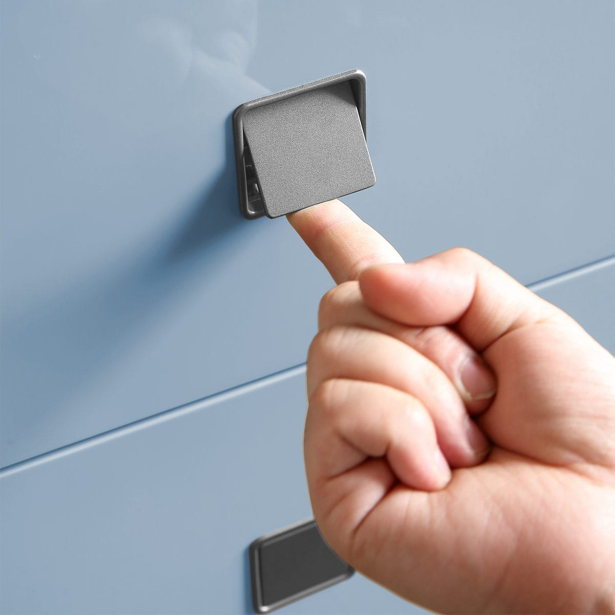 Made of blue lacquered wood, the spacious drawers provide ample room to keep your belongings safe. To open, they make clever use of a latch mechanism, beautifully finished in gunmetal. For further convenience, the lip of the table face is raised, keeping items securely in place. All of the edges and corners are rounded, emphasising the modern appearance.