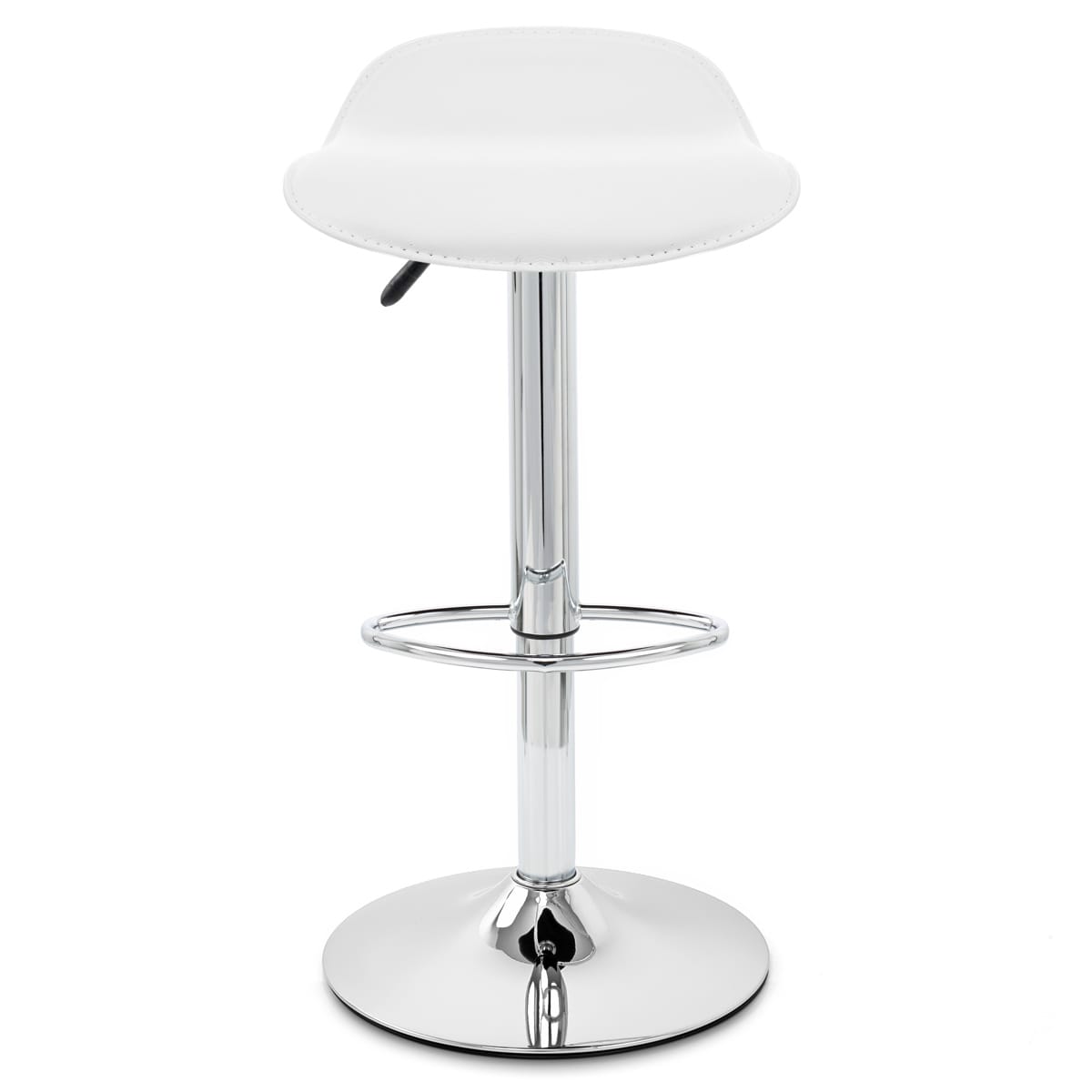 A small seat upholstered in crisp white faux leather is the focus of this design. The padded seat is comfortable, with a footrest beneath that adds to the relaxing properties of this stool.