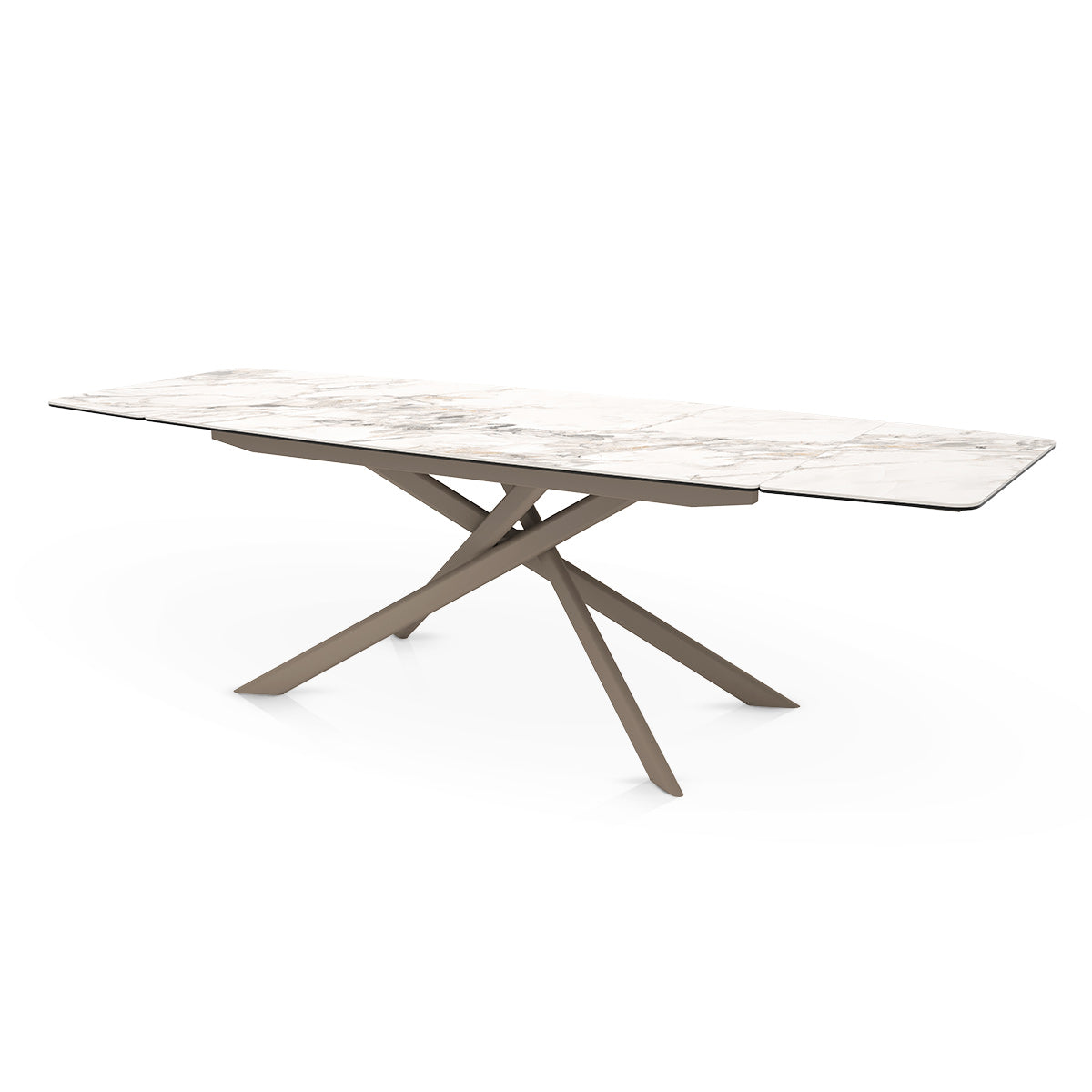 The table is supported by a robust metal frame finished in bronze, offering strength and contemporary style. Its unique crossed-leg design not only enhances stability but also creates a dramatic sculptural effect. Bracing bars run discreetly along the underside of the tabletop for added reinforcement. Protective feet beneath each leg help to safeguard flooring, ensuring practicality matches its bold and luxurious aesthetic.